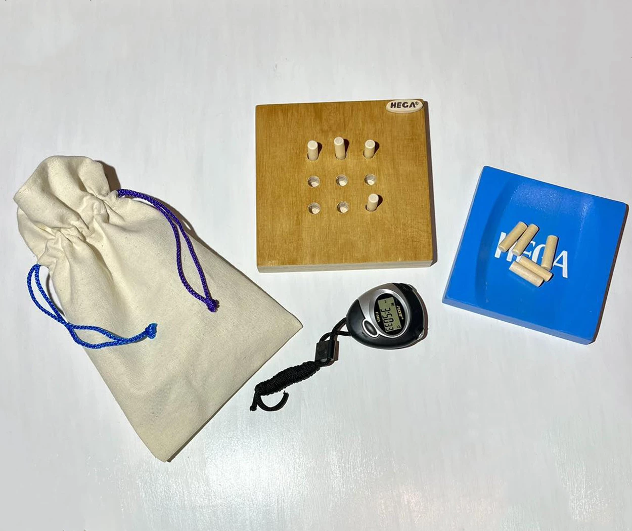 Комплектація модуля для оцінки дрібної моторики. Для проведення стандартизованого тесту з дев'ятьма отворами до набору включено: робочу панель з перфорацією та відповідну кількість кілочків (9 шт). Для зручності роботи використовується спеціальна підставка, а для зберігання всіх елементів передбачений міцний полотняний мішечок на зав'язках. Секундомір, що входить в комплект, дозволяє точно фіксувати швидкість моторної реакції пацієнта.