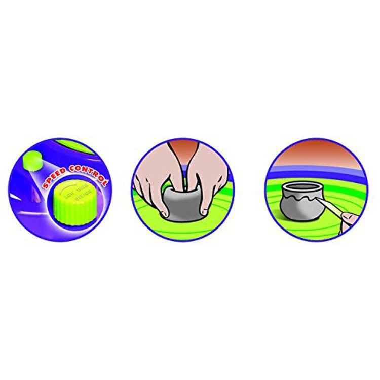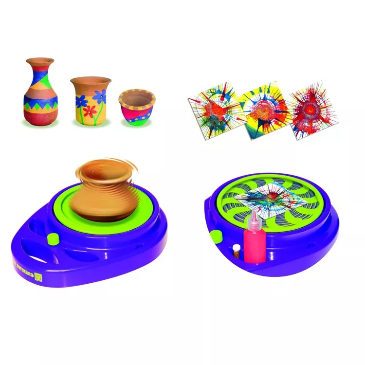 Створювати керамічні вироби та яскраві картини можна не виходячи з дому! Ця унікальна машина 2в1 оснащена замінним лотком: від гончарного круга до спин-арт кола, тому ви можете перейти від роботи з глиною до фарб! Верстат працює від батарейок.