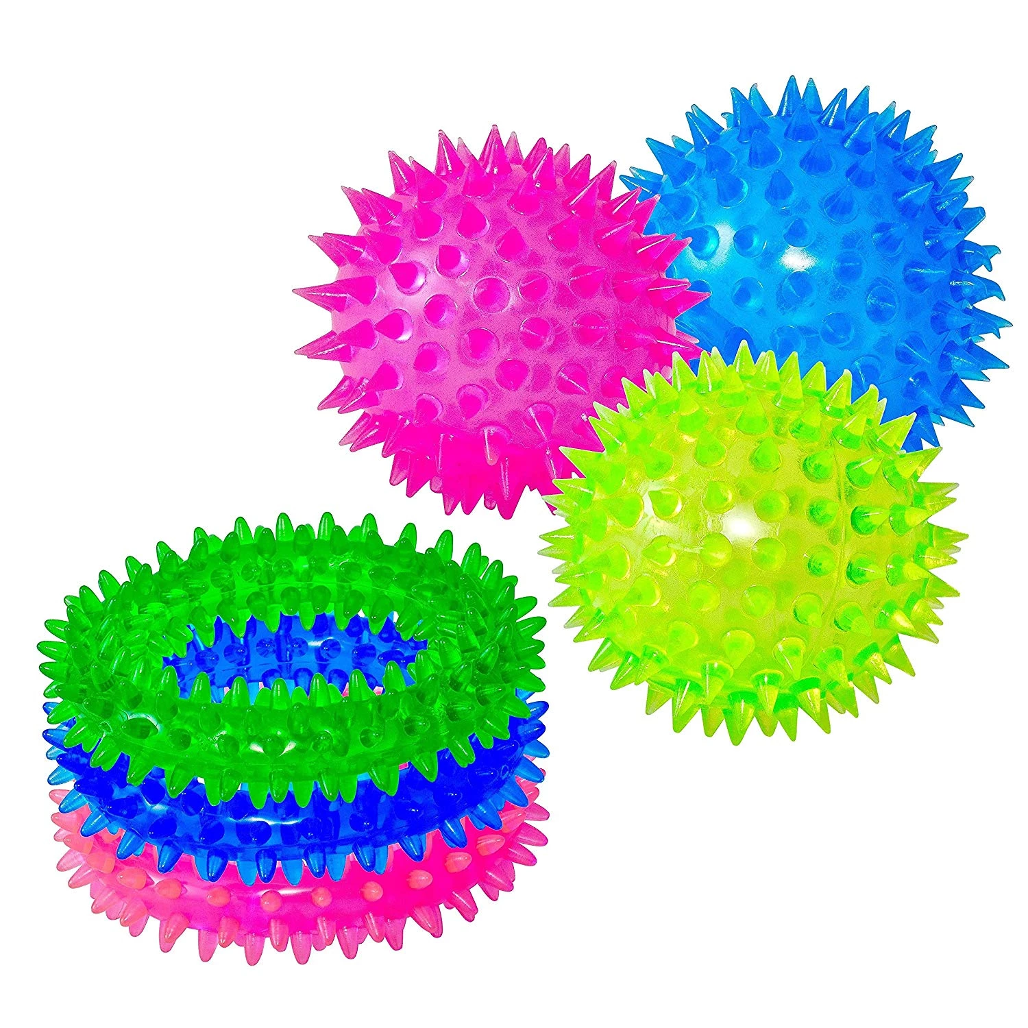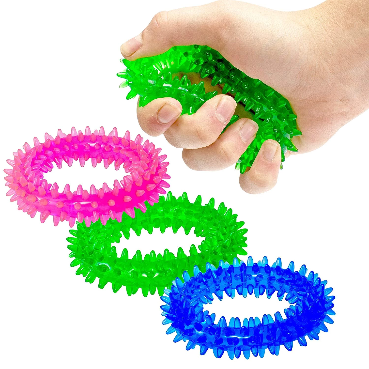 Кільця і м'ячики можна скручувати, стискати, кидати, жувати. Стиснення гострого надувного м'яча або стиснення гострого сенсорного кільця в руках - забезпечує ідеальне сенсорне тактильне враження. Виготовлені з 100% високоякісного термопластичного каучуку, вони гіпоалергенні, нетоксичні.