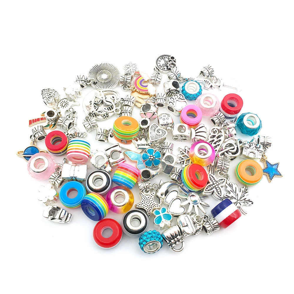Набір складається з 91 предмета. Тут ви знайдете 30 кулонів зі сплаву, 23 підвіски, 30 скляних намистин, 3 намиста та 5 браслетів.