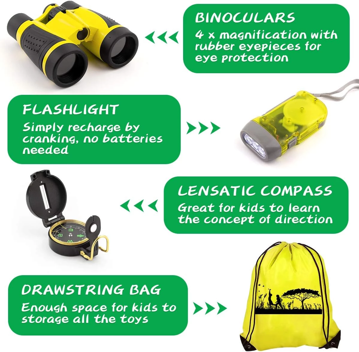 Цей набір для пригод та кемпінгу містить все необхідне для юних дослідників. Високоякісний бінокль допоможе дітям орієнтуватися у навколишньому середовищі. Компас, що входить до набору, навчить дитину визначати напрямок і місцезнаходження на картах або в польових умовах. Яскравий ліхтарик дозволить орієнтуватися навіть увечері. Комплект включає 24 предмети для дослідження місцевості, у тому числі бінокль, компас, свисток, ліхтарик, збільшувальне скло, сачок для метеликів, пінцет, затискач для комах, контейнер для збору комах, набір штучних комах, блокнот та сумку на зав'язках для зручного перенесення та зберігання.