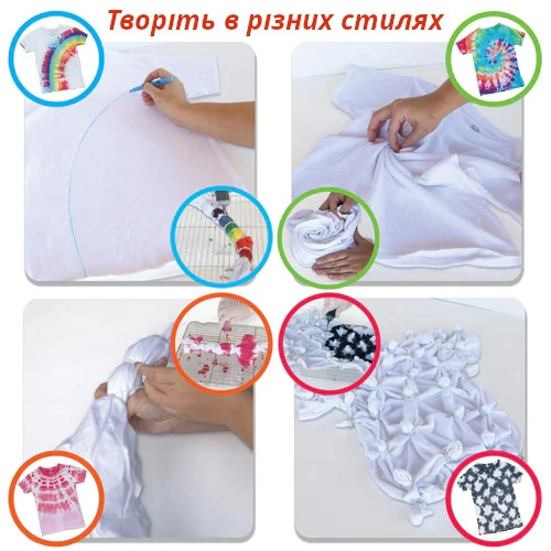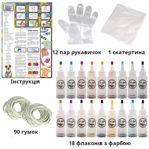 Представлений набір для творчості включає 18 флаконів з фарбою різних кольорів об'ємом 60 мл. У комплекті є фарби фіолетового, помаранчевого, чорного, зеленого, синього, жовтого, червоного, рожевого та інших кольорів. Також до набору входять додаткові аксесуари для роботи: 90 гумок, 12 пар захисних рукавичок, скатертина, а також інструкція.