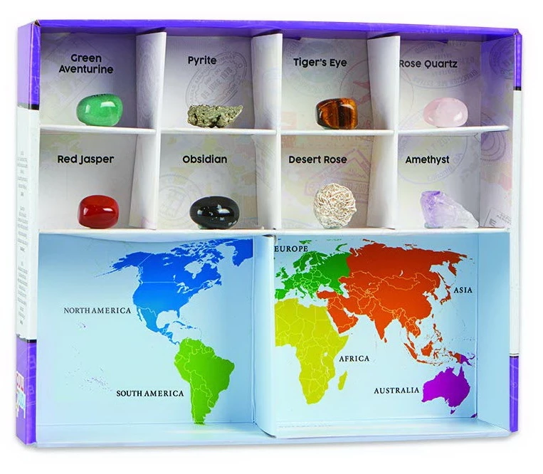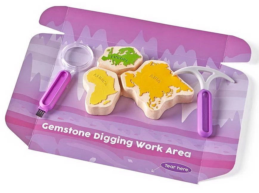 Пізнавальний дослідний набір ідеально підійде для любителів шукати скарби і колекціонувати цікаві камені. Є великі шматки глини у вигляді континентів, в яких заховані незвичайні зразки. За допомогою інструментів необхідно добувати їх, поступово оббиваючи глину. Сама коробка являє собою спеціальний бокс для знайдених зразків. За допомогою інструкції можна дізнатися багато нового і цікавого про геологію. Це відмінний подарунок на будь-яке свято.