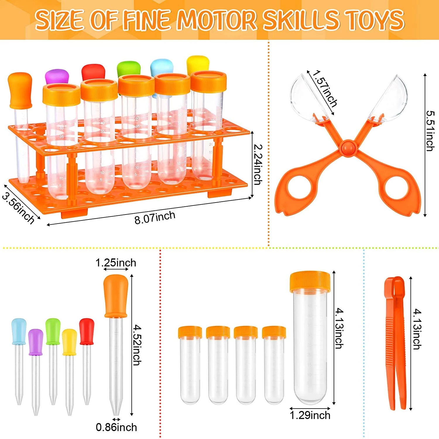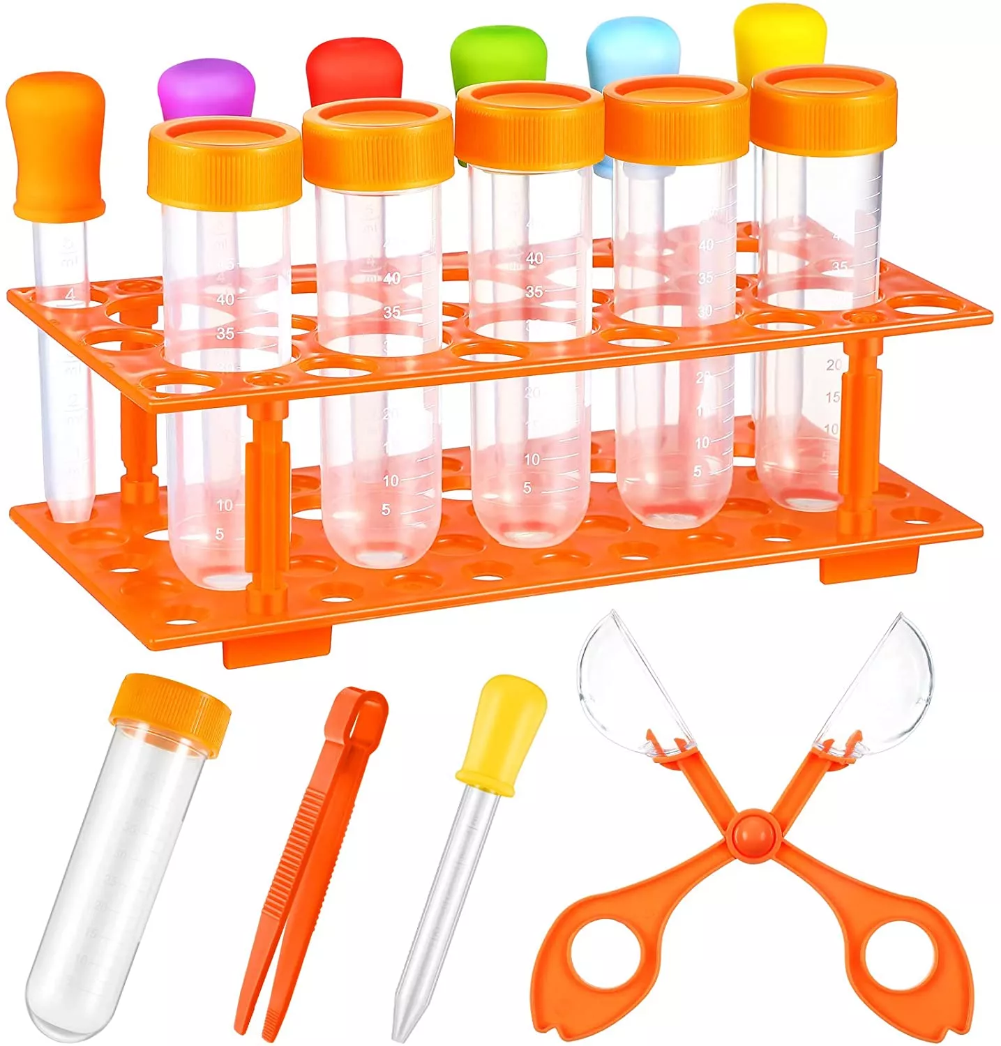 У комплект входить: 12 великих пробірок з набором підставки (5 великих пробірок, 6 силіконових крапельниць для рідини, 1 підставка для зберігання), а також 1 помаранчевий пластиковий пінцет і 1 сферичний пластиковий зажим для ножиць.