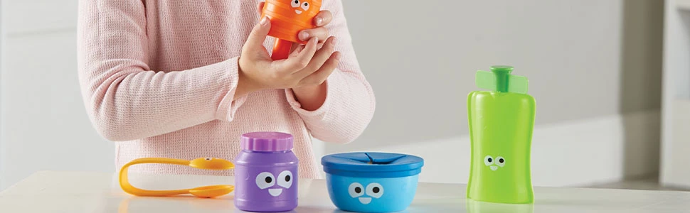 Снеки в наборі розвиває унікальні моторні навички — діти покращать хват, обертаючи кришку банки, розвинуть силу рук та багато іншого.