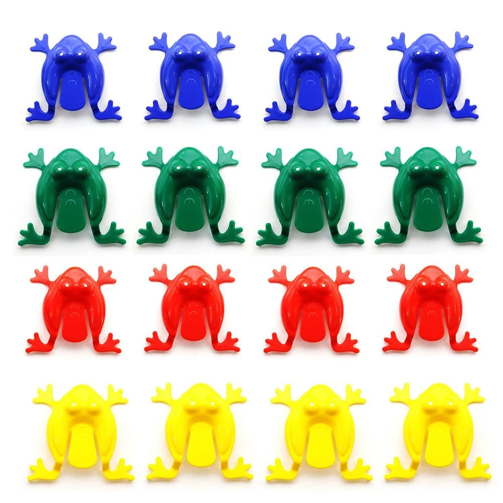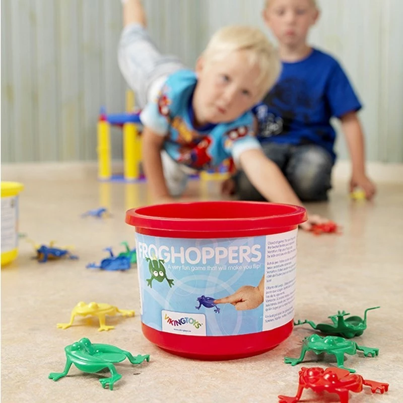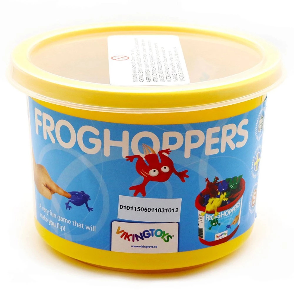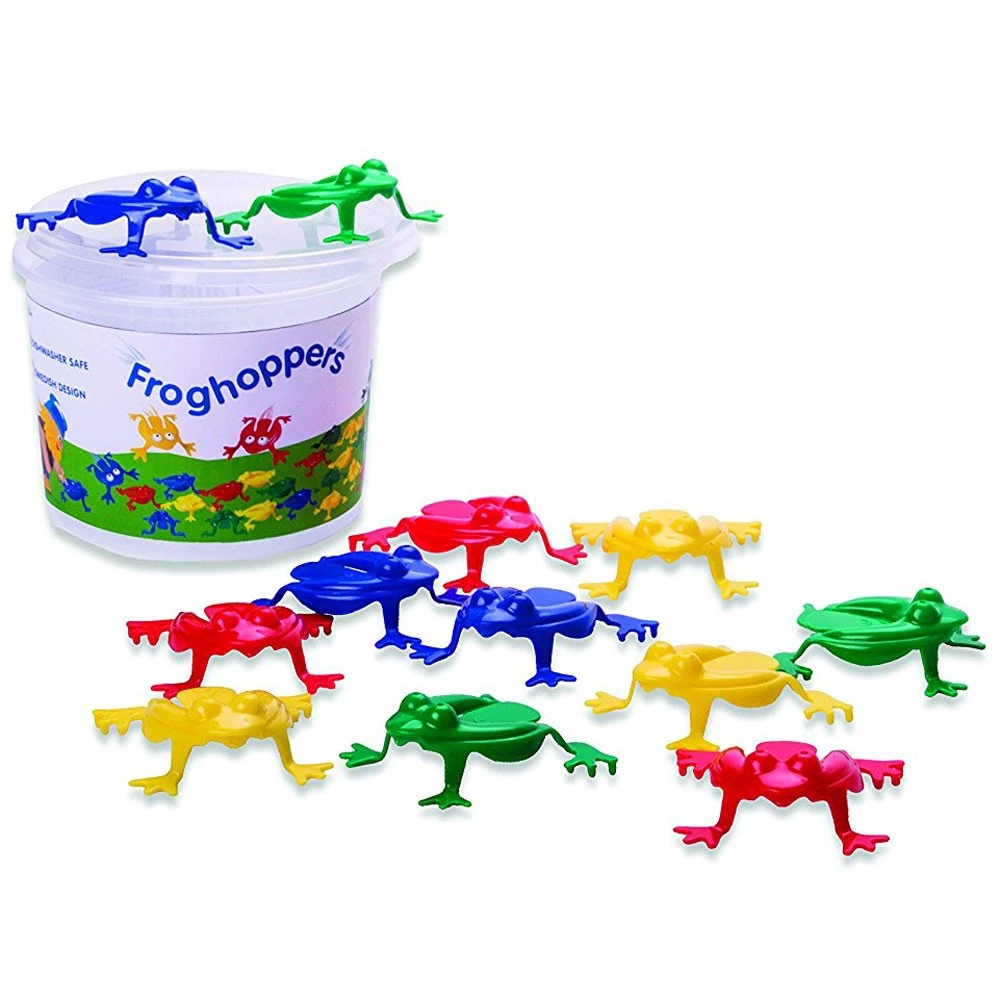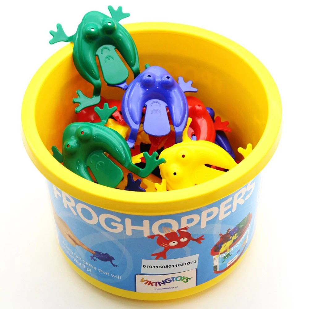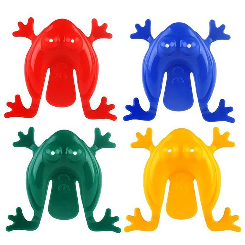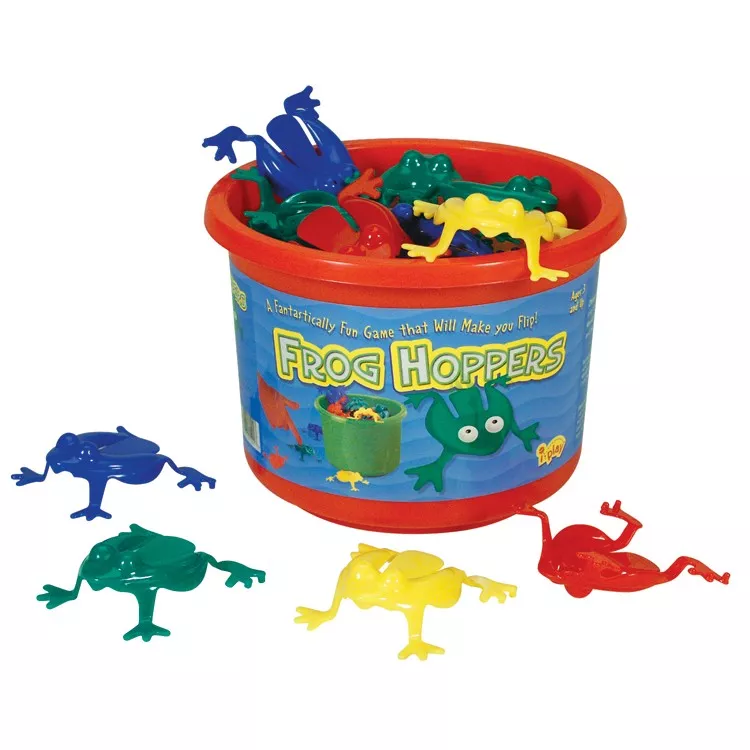 Набір смішних пластикових іграшок 4-х кольорів, які зберігаються в відерці. Грати можна по-різному - влаштовувати жаб'ячі гонки або грати "на влучність" - хто швидше відправить жаб свого кольору в відро.
