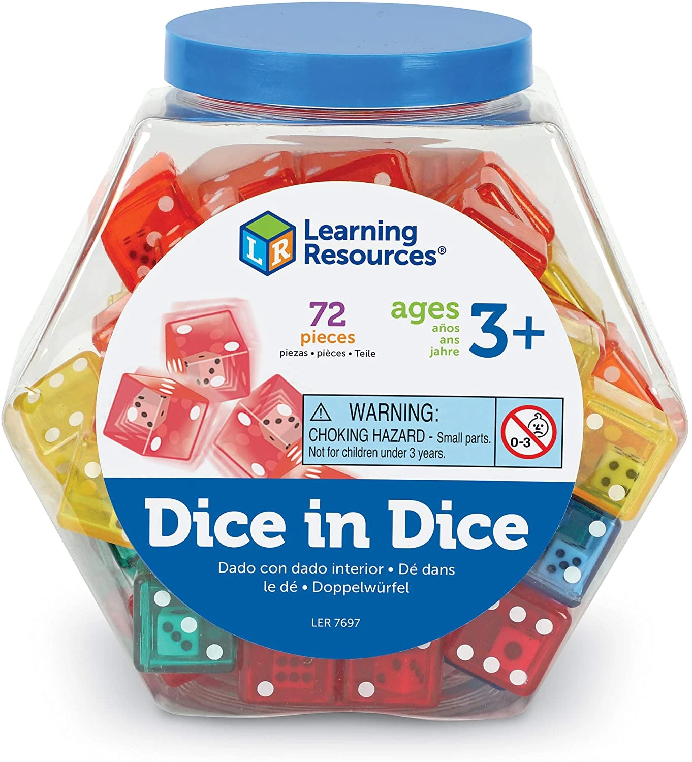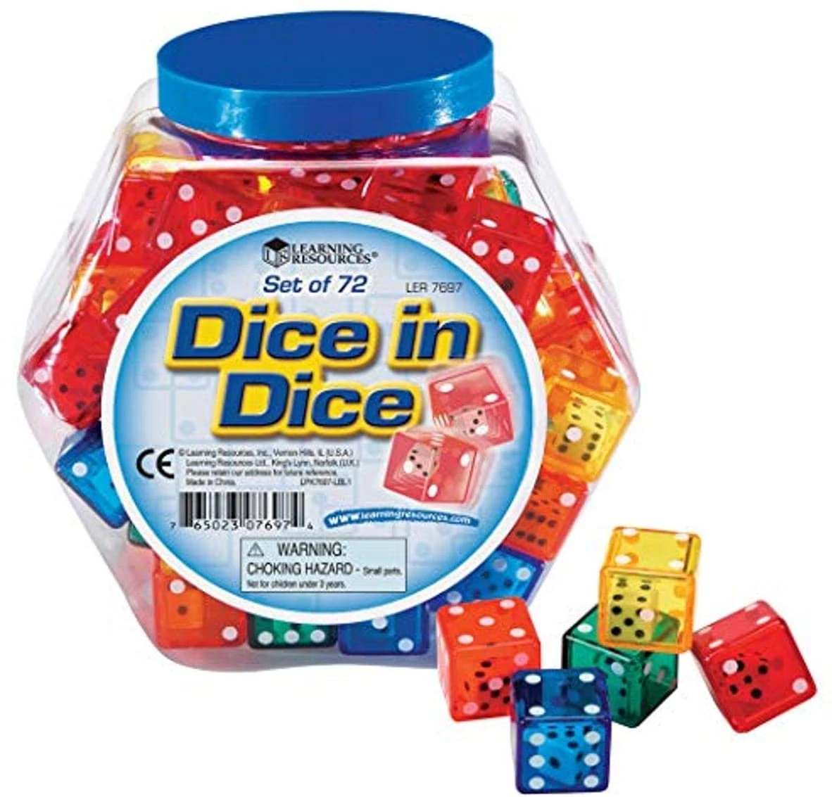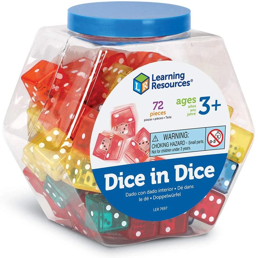 Залучіть учнів до понять числа, підрахунку, операцій та ймовірності за допомогою цих кубиків! Кожен напівпрозорий кубик містить всередині ще один. Набір із 72 костей поставляється у банці. Гра буде цікавою для малюків і для дорослих.