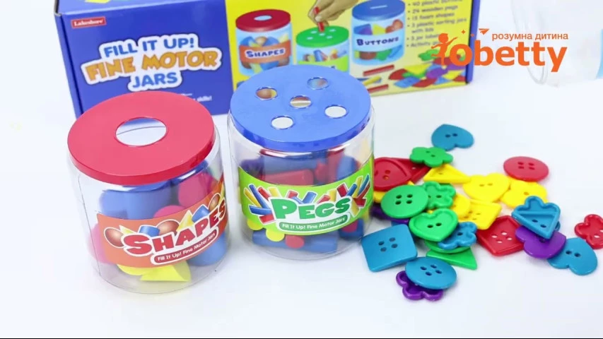 У наборі 3 прозорі банки з отворами різної форми в кришках... плюс 79 фігурок різної форми, які можна сортувати, включаючи гудзики, кілочки і пінні тривимірні форми.