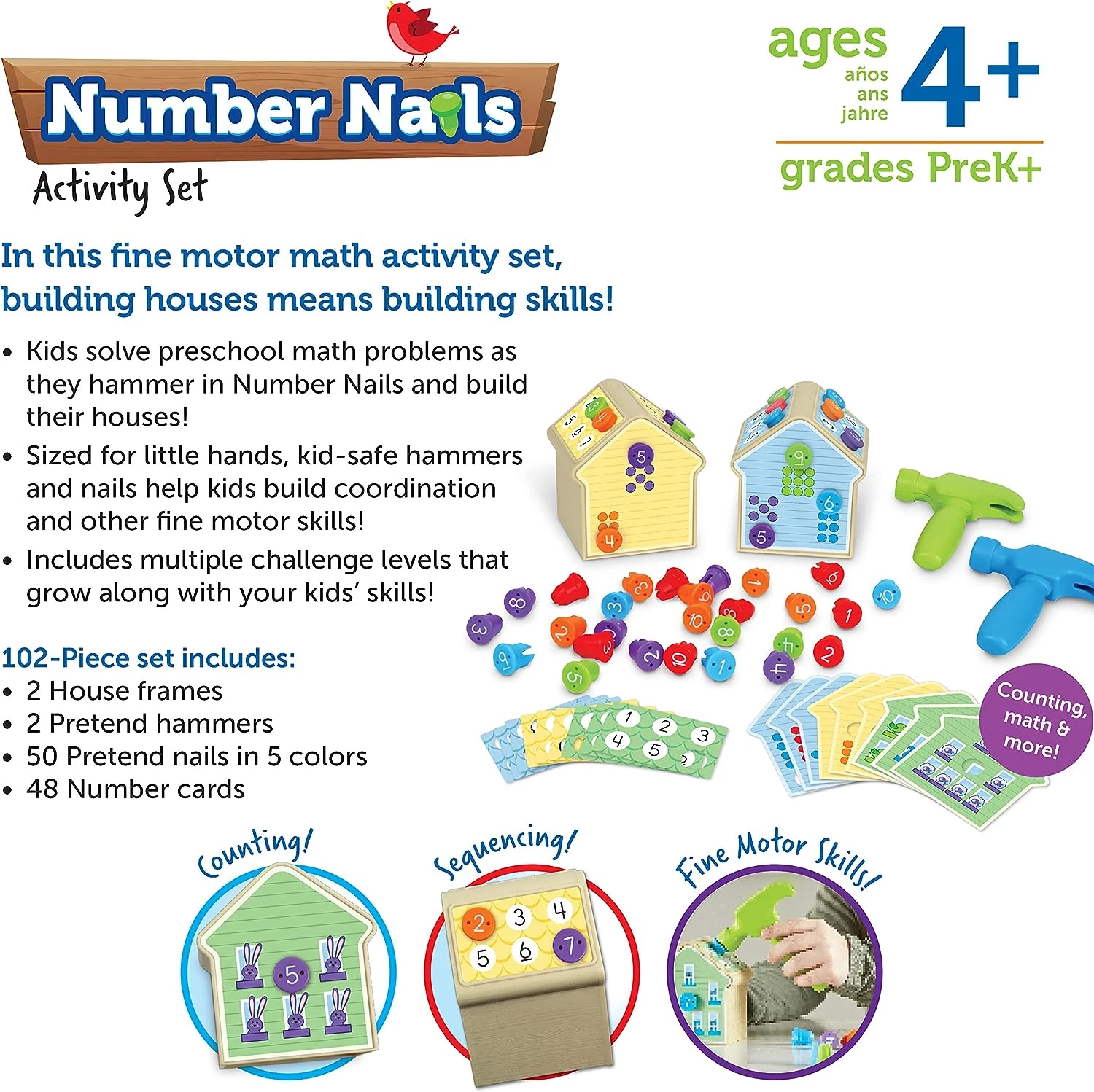 У кожному з двох будиночків дитячого розміру міститься 50 карток із завданнями на підрахунок та зіставлення. Завдання поділені на три рівні складності. Коли діти знайдуть правильну відповідь, вони зможуть вибрати відповідний цвях з номером та забити його безпечним іграшковим молоточком. У процесі гри, окрім розвитку математичних навичок, діти також тренують координацію, силу рук та інші важливі моторні навички щоразу, коли вирішують завдання та вбивають цвяхи.