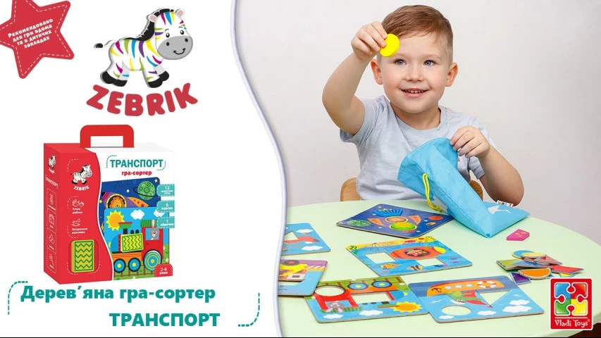 Вирушайте у захопливу подорож на гелікоптері під керуванням жирафу! Звірятка чекають, поки малюк візьме різнокольорові деталі та почне доповнювати ними картонні картинки, на яких зображені різні види транспорту. Кожна деталь має свої колір та форму.
