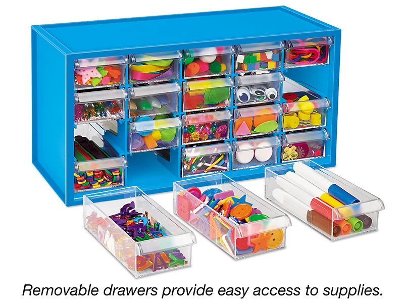 У цьому зручному контейнері з шухлядками ви знайдете різні предмети для творчості! 20 прозорих скриньок з помпонами, різнокольоровими очима, блискучими трубочками і іншими предметами для творчості! У наборі є підручник з 14 проектами.