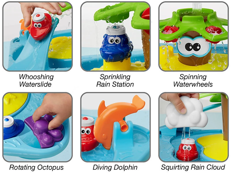 Купання у ванні буде веселим з цим плавучим островом. Налийте воду в фонтан пальму за допомогою зручного стаканчика, щоб водяні коліщатка крутилися. Два човна, пливуть навколо фонтану, повз рухомі перешкоди і в ванну! У наборі ще є мила хмарка, яка бризкає дощиком!