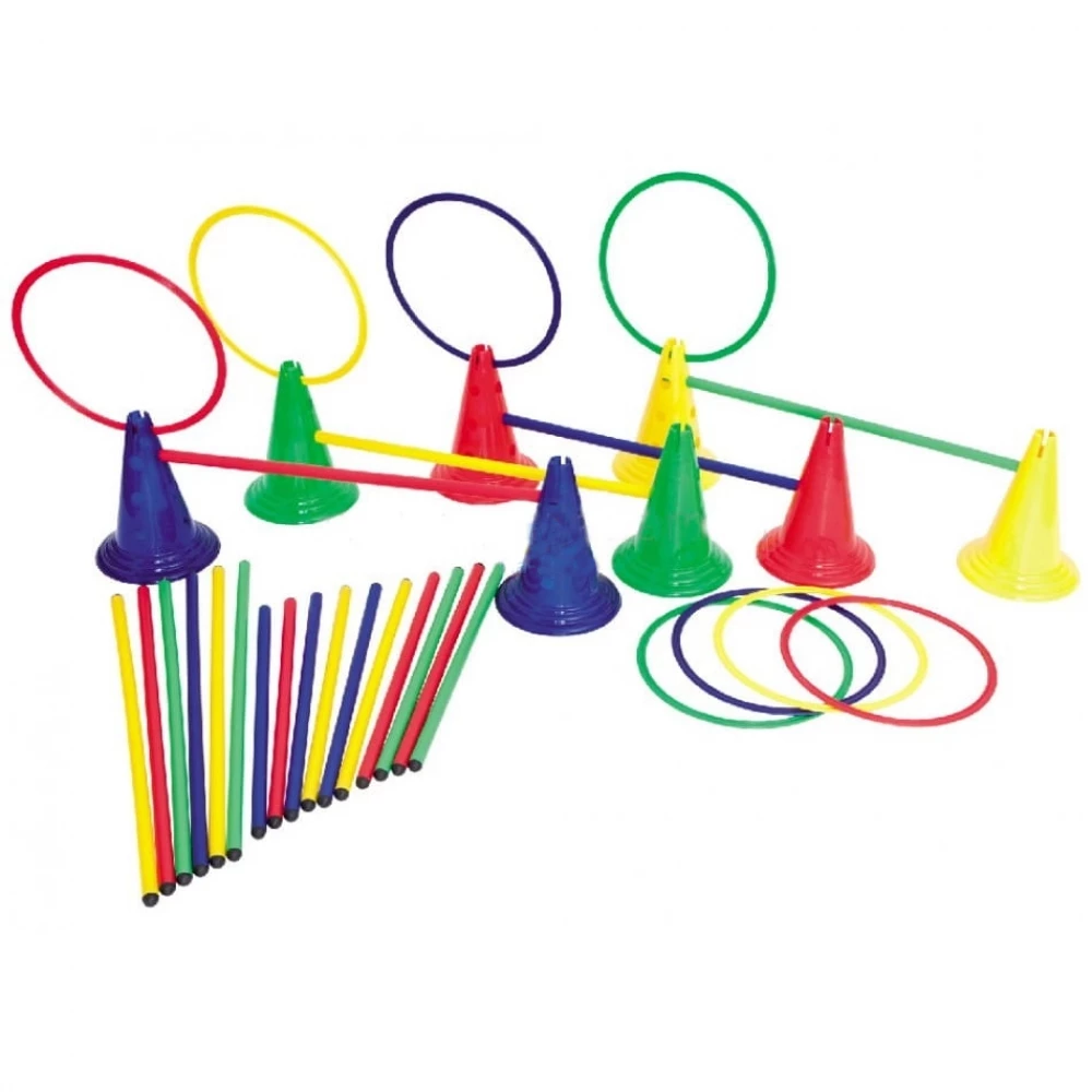 Представлений спортивний набір включає вироби, призначені для різних гімнастичних вправ і спортивних змагань. Елементи можна поєднувати, створюючи перешкоди різної висоти. Набір можна використовувати у спортивних залах, у квартирах, дитячих садках, школах, на природі. Підходить для занять фізкультурою, проведення змагань та естафет, спортивних ігор.Ігри з аксесуарами, що входять в гімнастичний набір, розвивають спритність, швидкість, координацію рухів та інші навички.