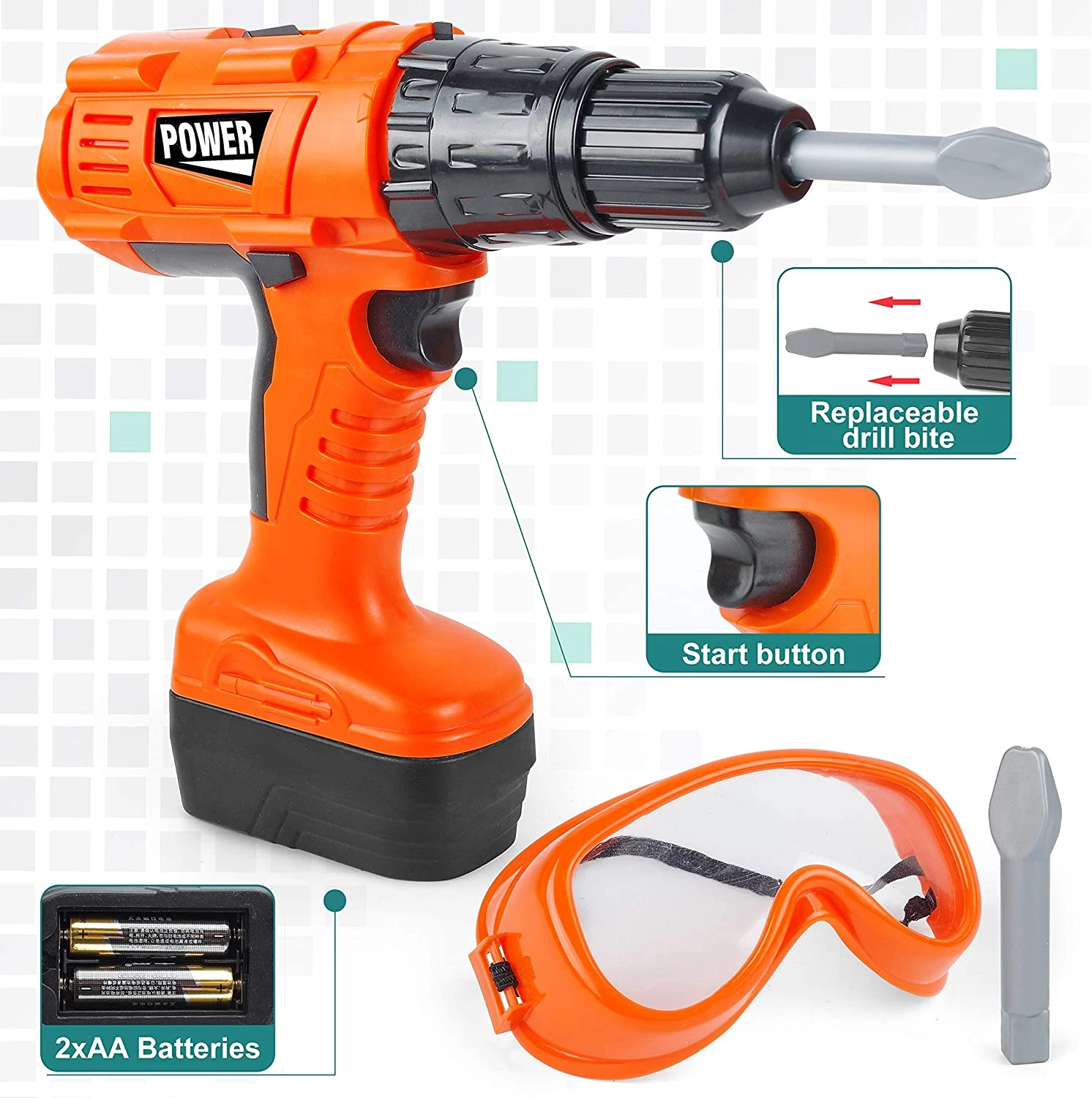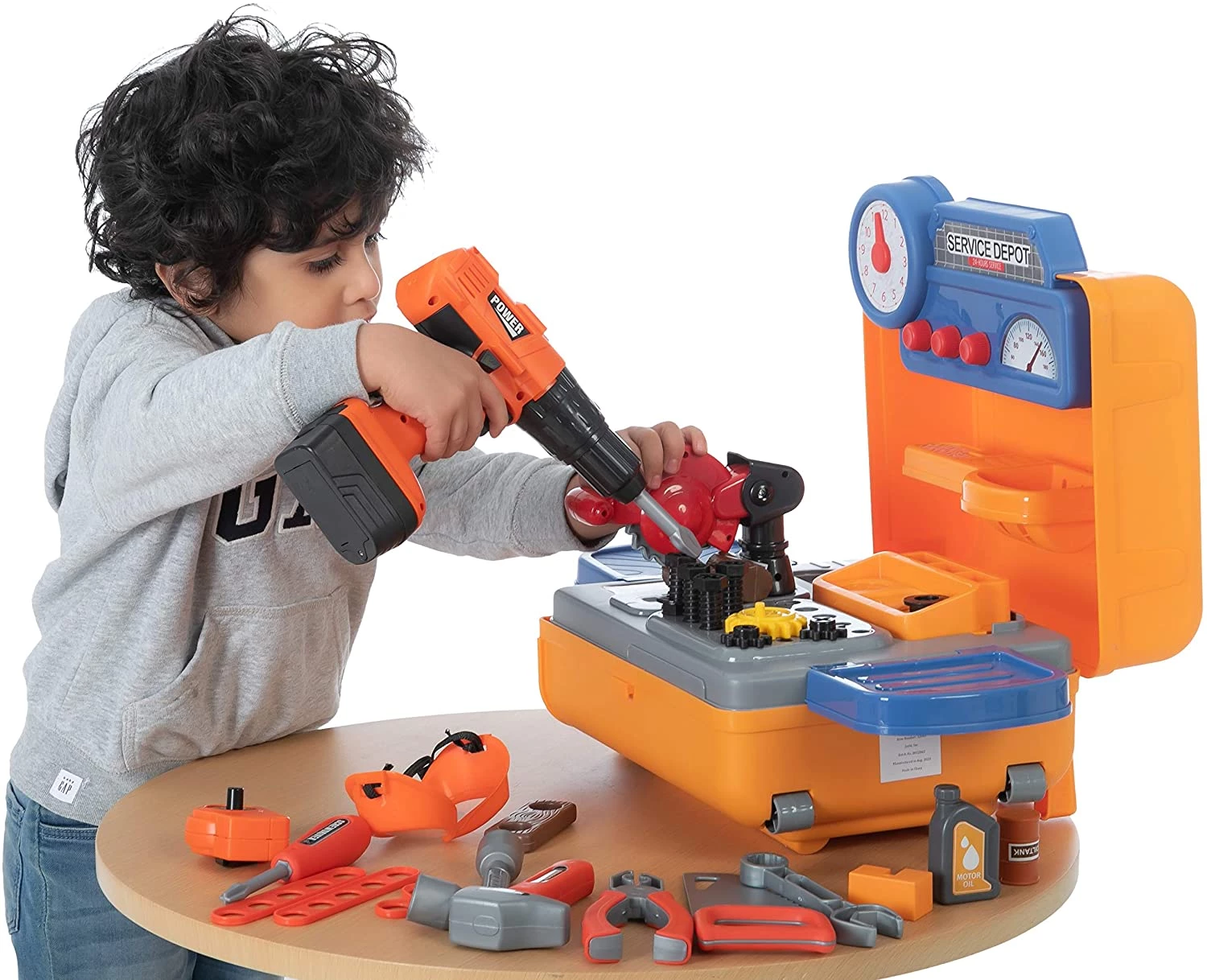 Інструменти зроблені максимально реалістично. Дриль дзижчить при натисканні на кнопку. Ідеально підходить для сюжетних ігор, розвитку фантазії і моторики. Матеріал, з якого зроблений набір - безпечний і нетоксичний. Відповідає стандартам іграшок.