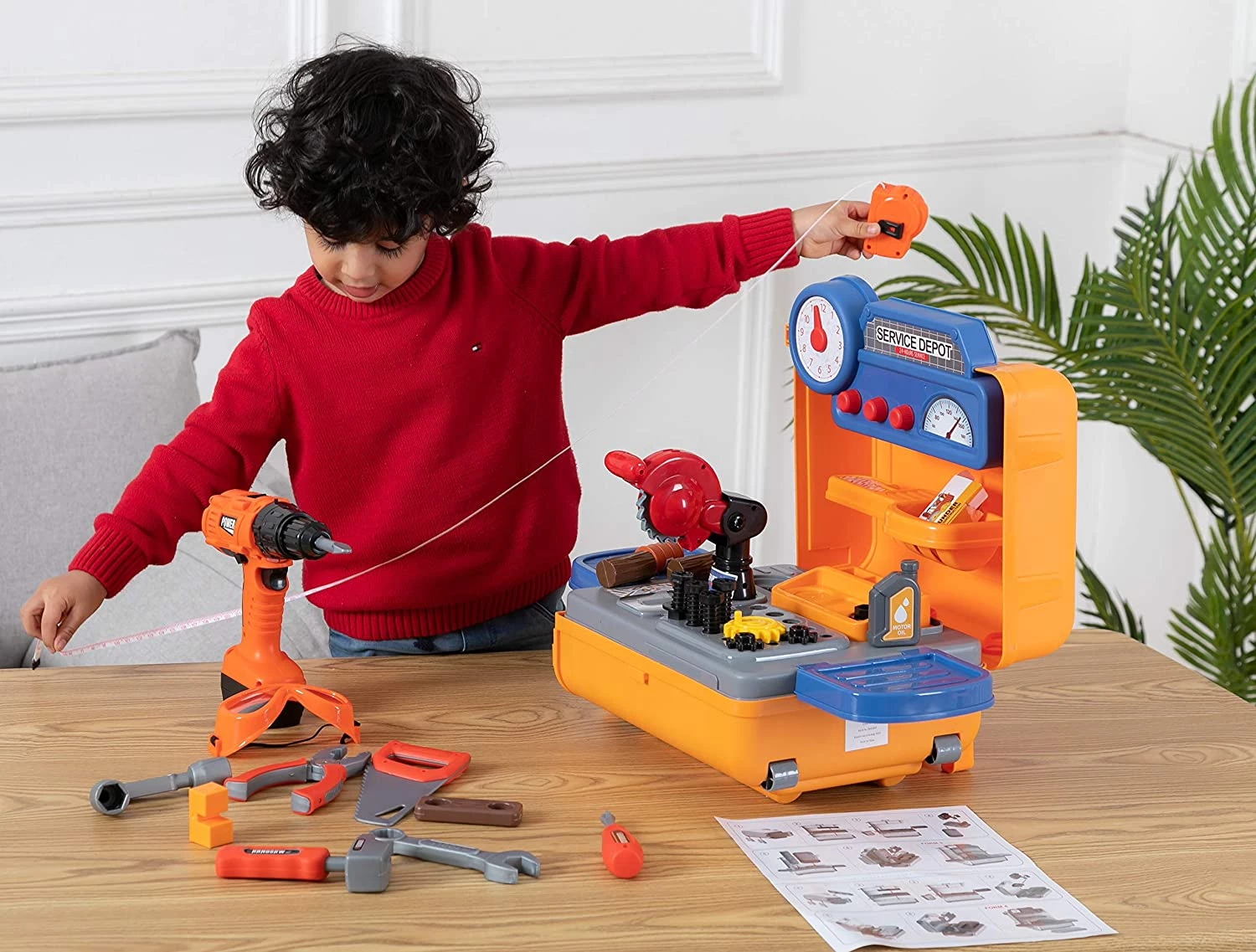 Захоплюючий набір ціла майстерня, прямо як у тата - мрія кожного хлопчиська. Такий набір чудово впишеться в домашню майстерню дитини і допомагає освоїти процес проектування, розвиває вміння майструвати. А також формує у хлопчика такі навички як любов до праці, самостійність, кмітливість, бажання і вміння творити, об'ємне уяву. Набір включає в себе рулетку і високоякісну електричну іграшкову дриль і інші будівельні інструменти, які надовго захоплять увагу дитини.