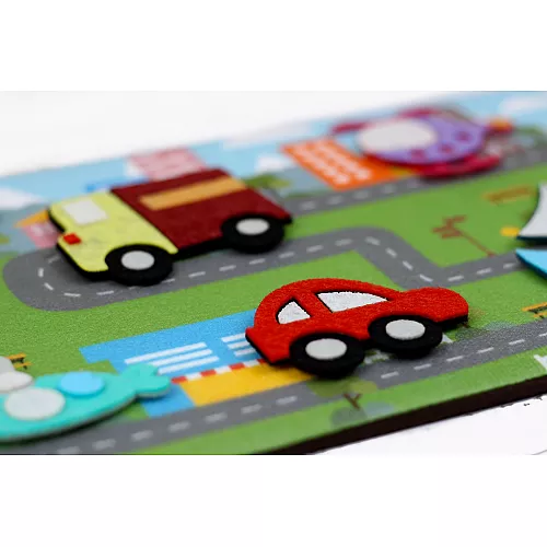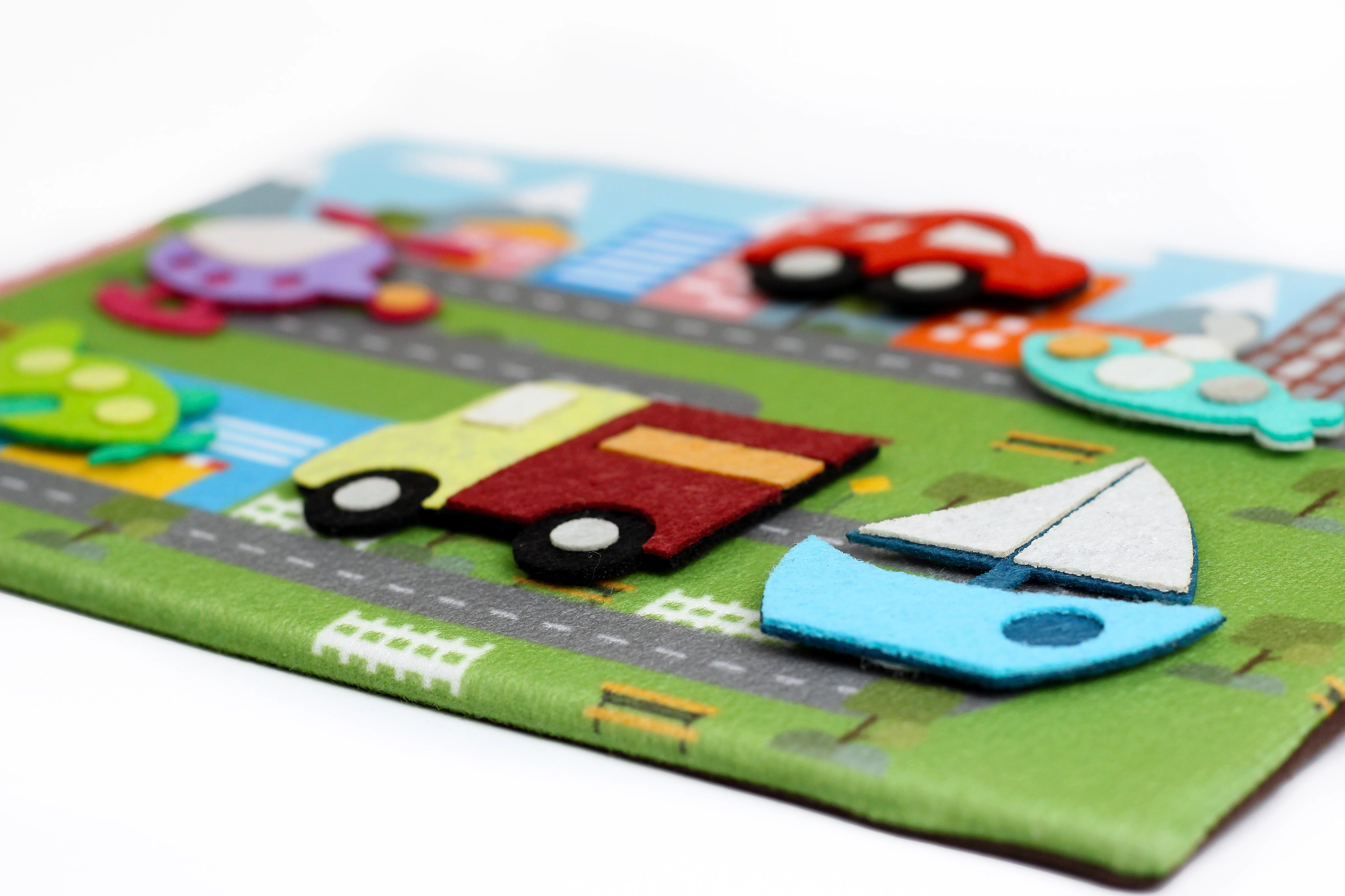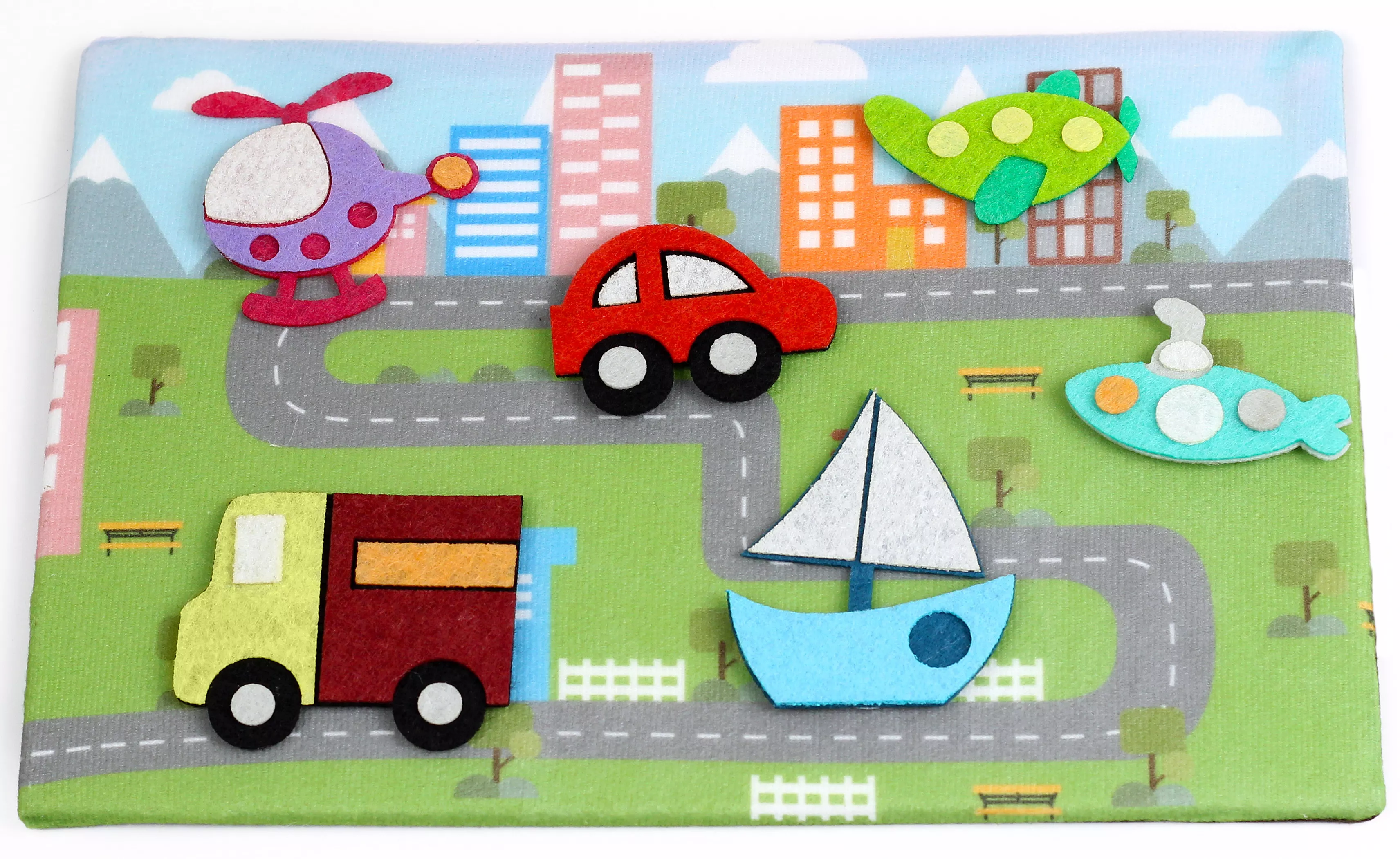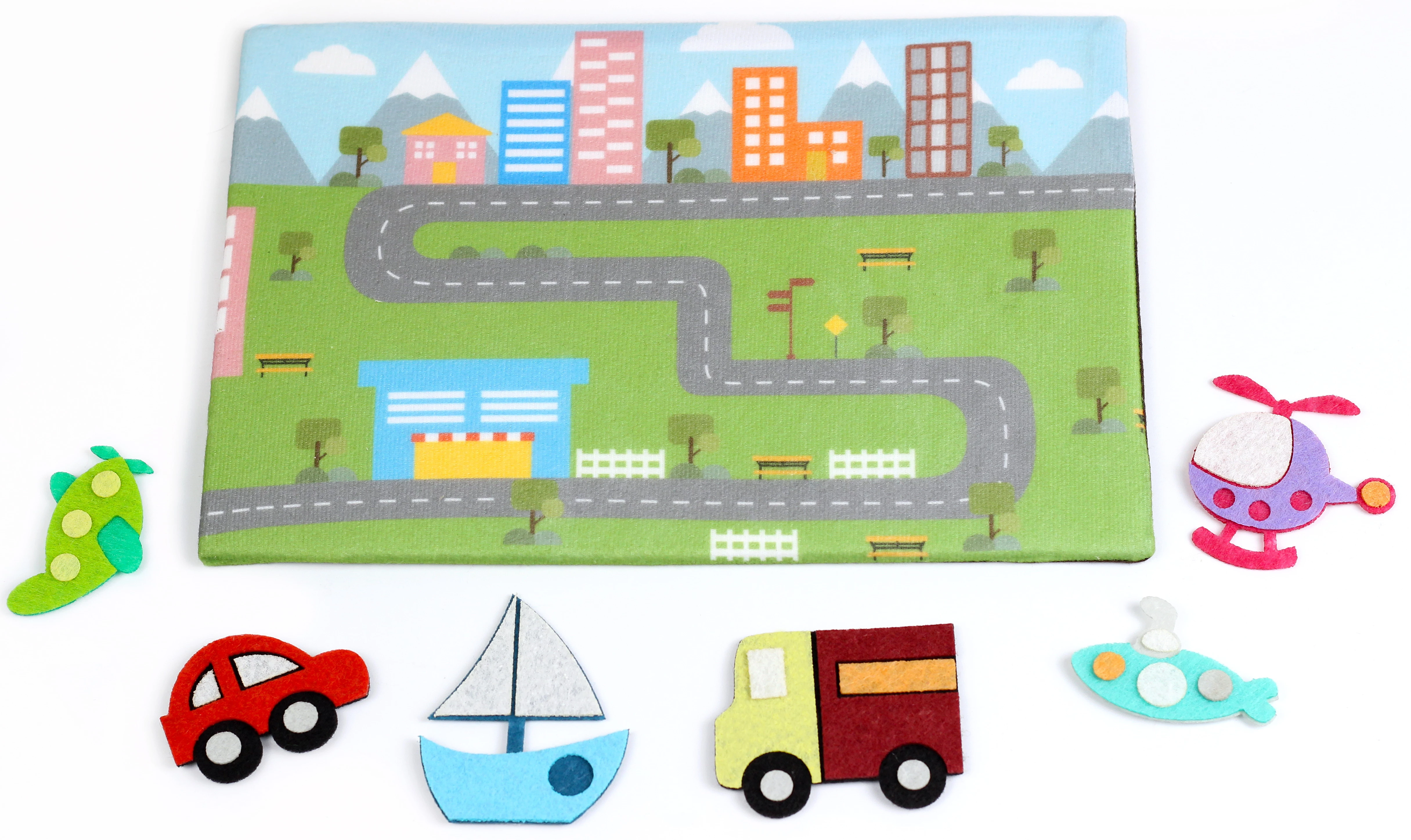 Дитяча уява не знає кордонів! Ваша дитина зможе придумати безліч історій з цим набором. Набір складається з килимка у вигляді карти міста і різних видів транспорту (вертоліт, літак, машина, вантажівка, корабель, підводний човен) на липучці. Дитина може переміщати машинки, міняти їх місцями, придумуючи цікавий сюжет.