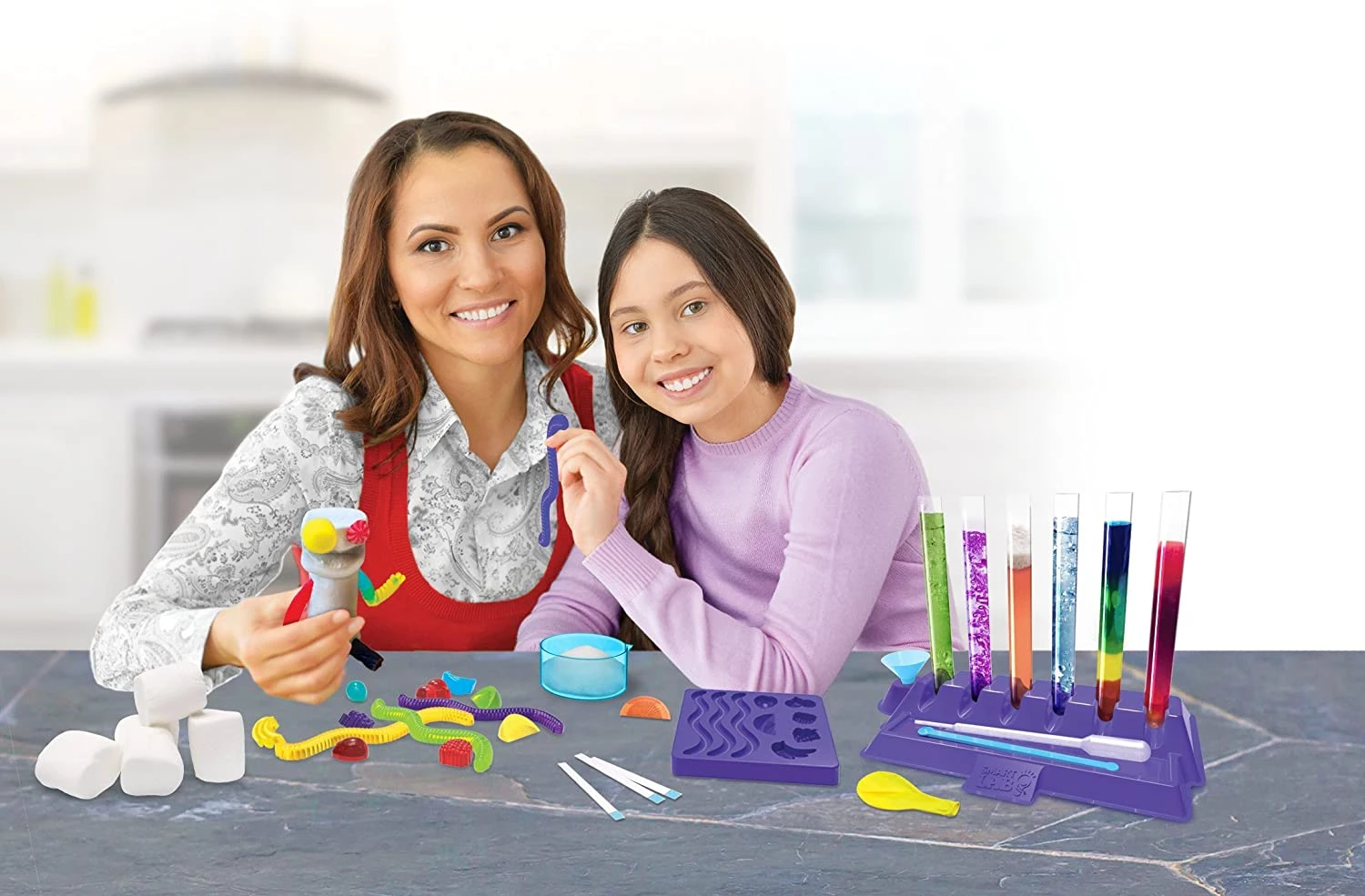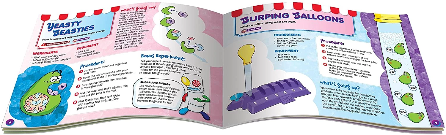 Цей кухонний хімічний набір - солодке задоволення для всіх, хто задавався питанням, що робить цукор липким або чому він іскриться в темряві. 24-сторінковий ілюстрований буклет допоможе дітям провести 20 експериментів, в яких вони дізнаються про осмосі, поверхневому натягу, випаровуванні, насичення, кислоти, карамелізації, полімери, щільності, ферментах, глюкози і багато іншого найсмачнішим способом!