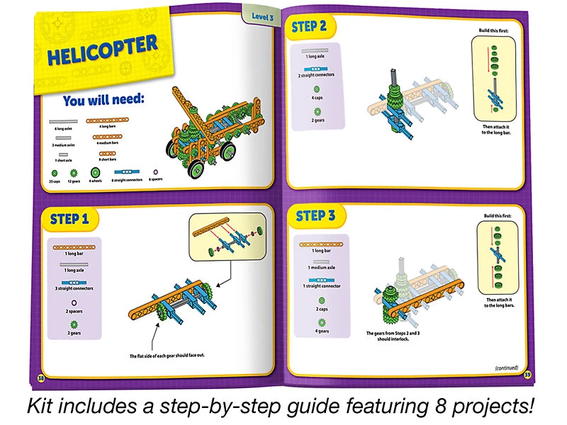 За допомогою інструкції можна побудувати до 8 моделей, таких як: катапульта, вертоліт і автомобіль з гідравлічним підйомником.
