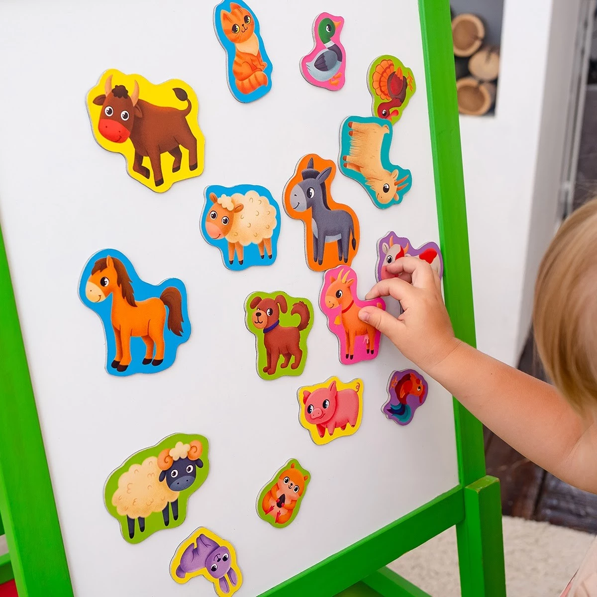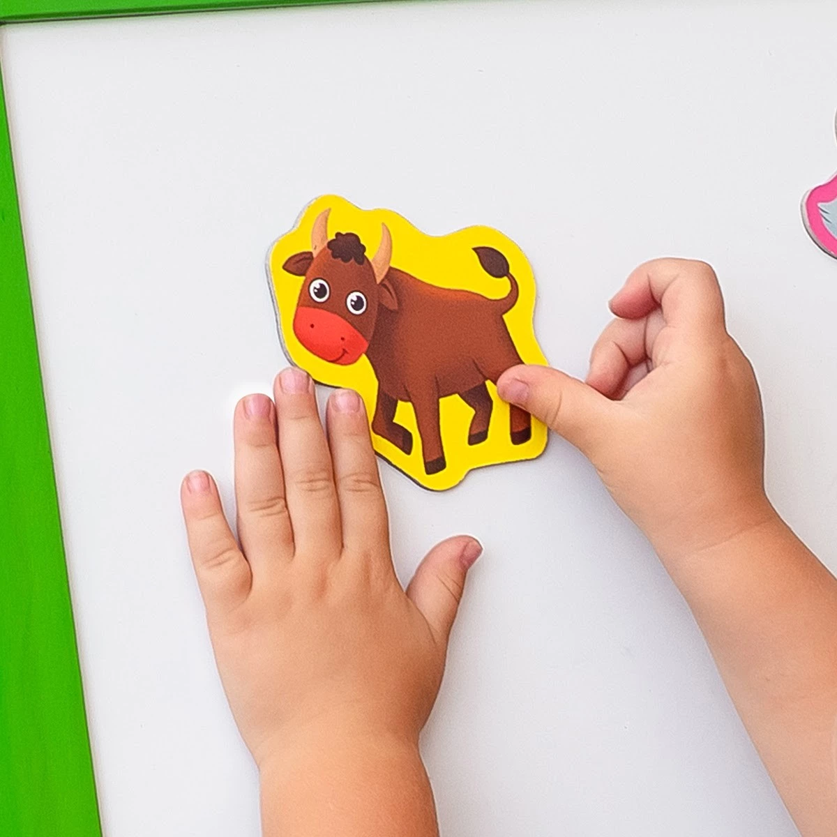Цей магнітний набір - цікава і корисна іграшка, яка познайомить малюків з тваринами, які мешкають на фермі. Розгляньте з малюком усі магніти, що входять до набору. Вивчіть кожну тварину, зображену на магнітах, розкажіть дитині, як тварини називаються, що їдять, які звуки видають. Можна навіть запропонувати дитині скласти невеликі історії про цих тваринок.