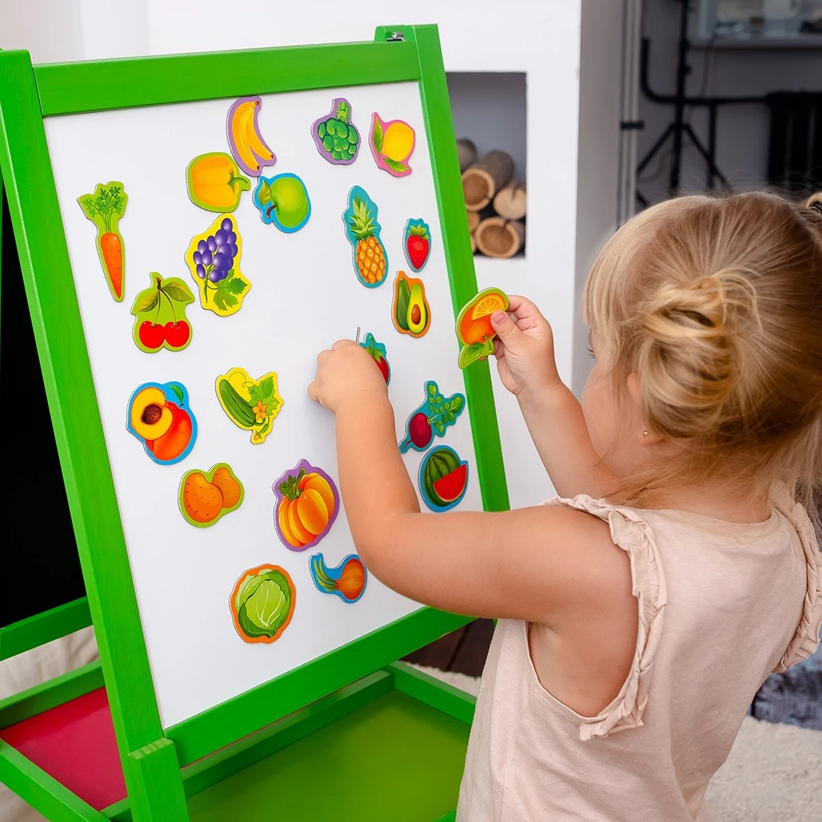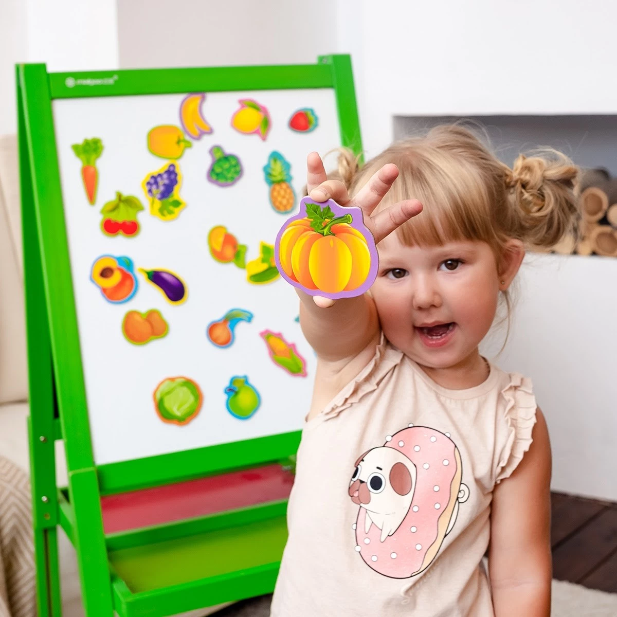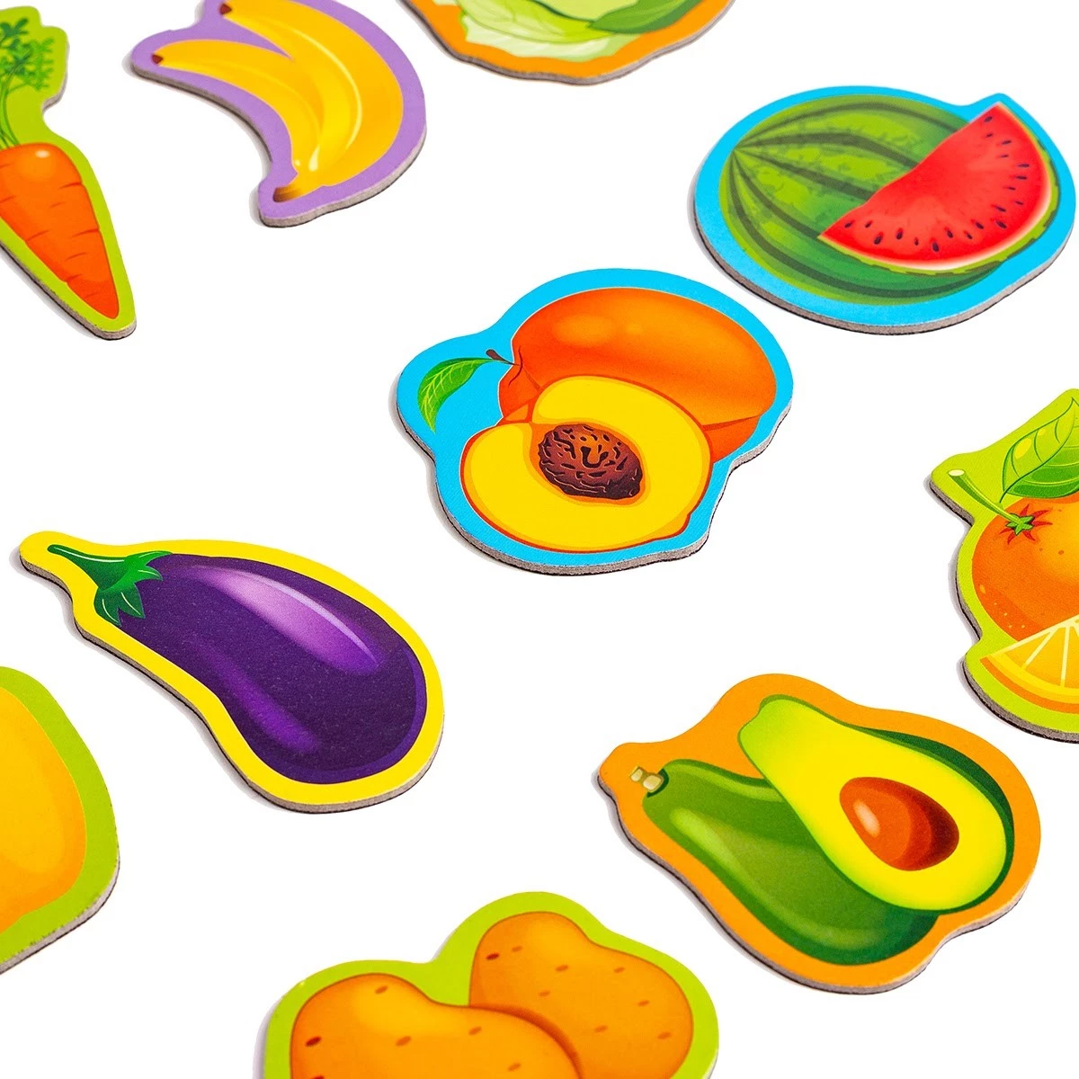 Цей набір – веселий та захопливий спосіб познайомити дитину з фруктами та овочами. У комплект входять ігрові магніти, які познайомлять дитину з різноманітними плодами та їх особливостями. Магнітики легко та зручно тримати у дитячих ручках. Кожна деталь має шар щільного картону.