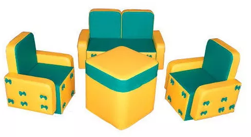 Набір м'яких меблів підходить для громадської та домашньої дитячої кімнати, розвивають центрів, залів очікування, лікарень і дитячих садів. У комплект входить стіл, диван і 2 крісла, на яких діти зможуть грати, читати і відпочивати. Вироби зроблені з м'яких модулів, наповнені пінополіуретаном і обтягнуті знімним чохлом. М'які меблі легко очищається від бруду, міцні і має презентабельний вигляд. Дизайн меблів приваблює дітей, гармонійно виглядає в будь-якому інтер'єрі.