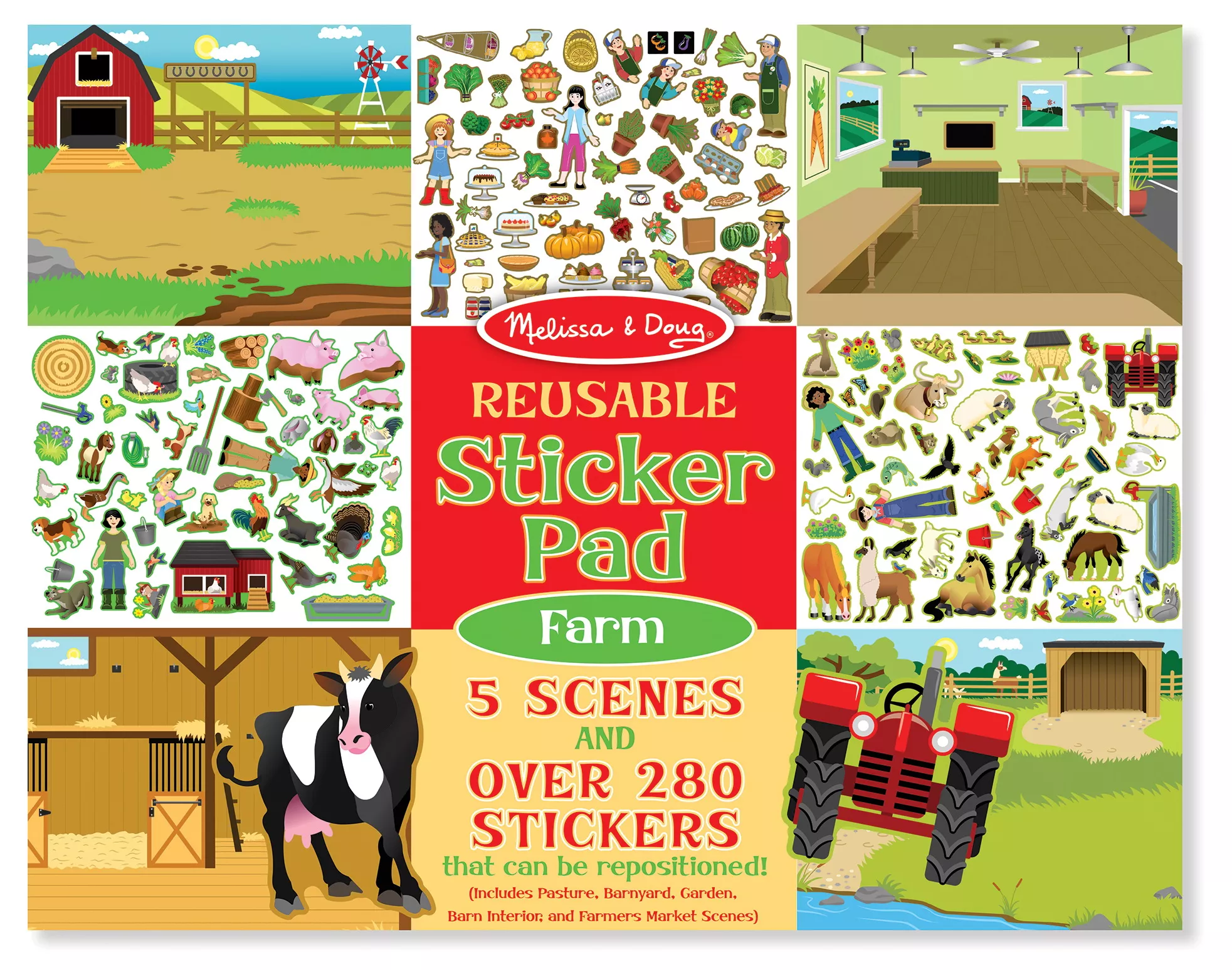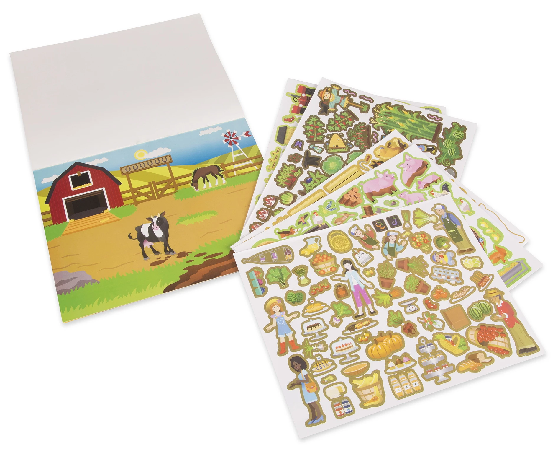 Чудовий комплект для захоплюючого заняття з друзями. У ньому є п'ять картинок і більше 280 стікерів, з їх допомогою можна створити справжню ферму, пасовище, сарай або сад. Основна перевага цього набору в тому, що наклейки можна легко знімати і переклеювати, так як вони багаторазові. Стікери дуже барвисті і яскраві, всі деталі прекрасно промальовані і виглядають стильно.