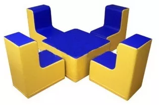Даний ігровий комплект являє собою набір з столу і 4-х стільців в синьо-жовтих кольорах. М'які меблі стане незамінним функціональним об'єктом, на якому діти зможуть читати, відпочивати і грати. Комплект можна розмістити в дитячій зоні, лікарні, школі, дитячому садку. Меблі складається з 2-х елементів: наповнювача з пінополіуретану, який забезпечує м'якість і комфортну посадку і знімного чохла, який відмінно миється і не вибагливий у догляді.