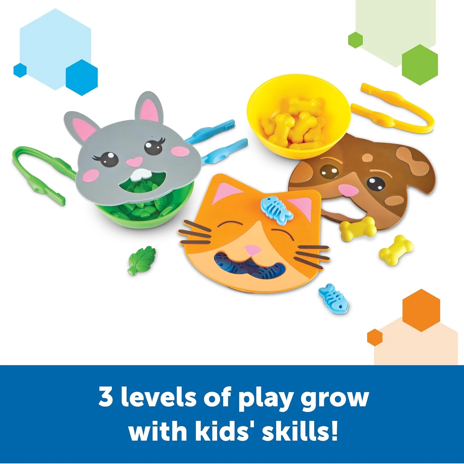 Рот кожного звірятка має унікальну форму. Три рівні складності сприяють розвитку координації, точності та інших навичок. Діти можуть сортувати ласощі у вигляді тварин за формою або зіставляти їх із мисками того ж кольору, щоб покращити навички розпізнавання кольорів та форм.