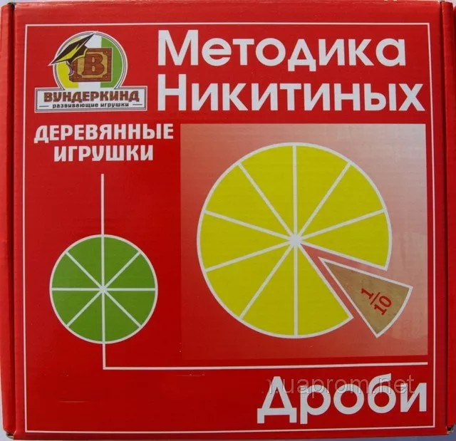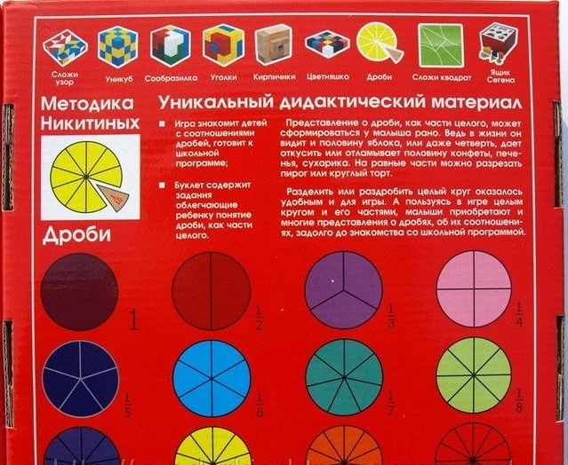 З цим набором, за методикою Нікітіних, діти на практиці отримують знання про поняття дробів, використовуючи цілий круг і його частини. Набір виконаний з дерева і абсолютно безпечний для дітей. Буклет із завданнями зацікавить дитини і допоможе швидше освоїти дроби.