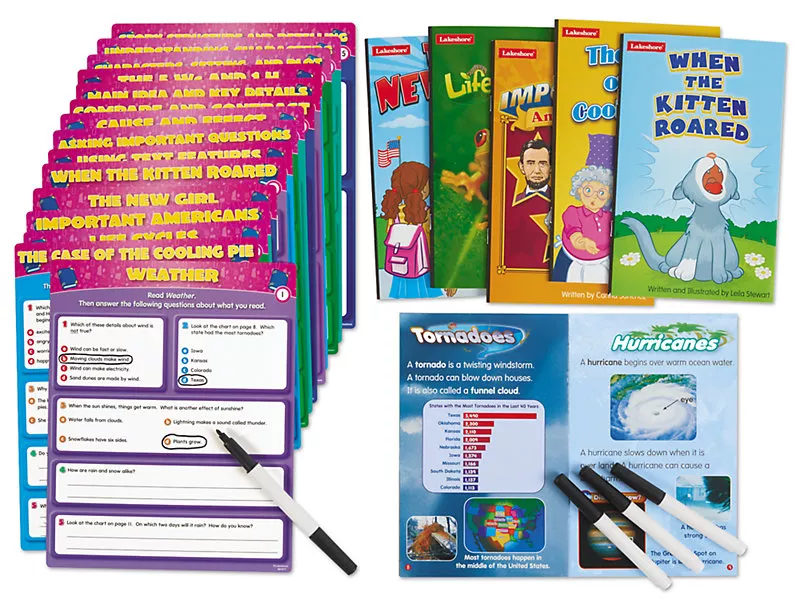 У центрі є картки для письма і стирання, які орієнтовані на певні навички читання, включаючи визначення причин і наслідків, основних ідей і багато чого іншого. Діти просто вибирають картку із завданням і книгу, слідують поетапні інструкції, щоб заповнити їх, а потім за допомогою картки для відповідей перевіряють роботу!