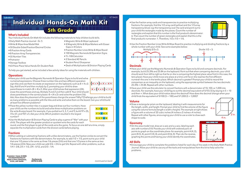 Універсальний математичний набір підходить для занять в класі, дистанційного навчання або дома. Підходить для п'ятикласників, які зміцнюють ключові математичні навички! У набір входить зошит з щоденними математичними завданнями, магнітна дошка для запису, картки з дробом і багато іншого. Під час занять, діти зможуть освоїти: від множення дробів до багатоступеневих завдань зі словами.