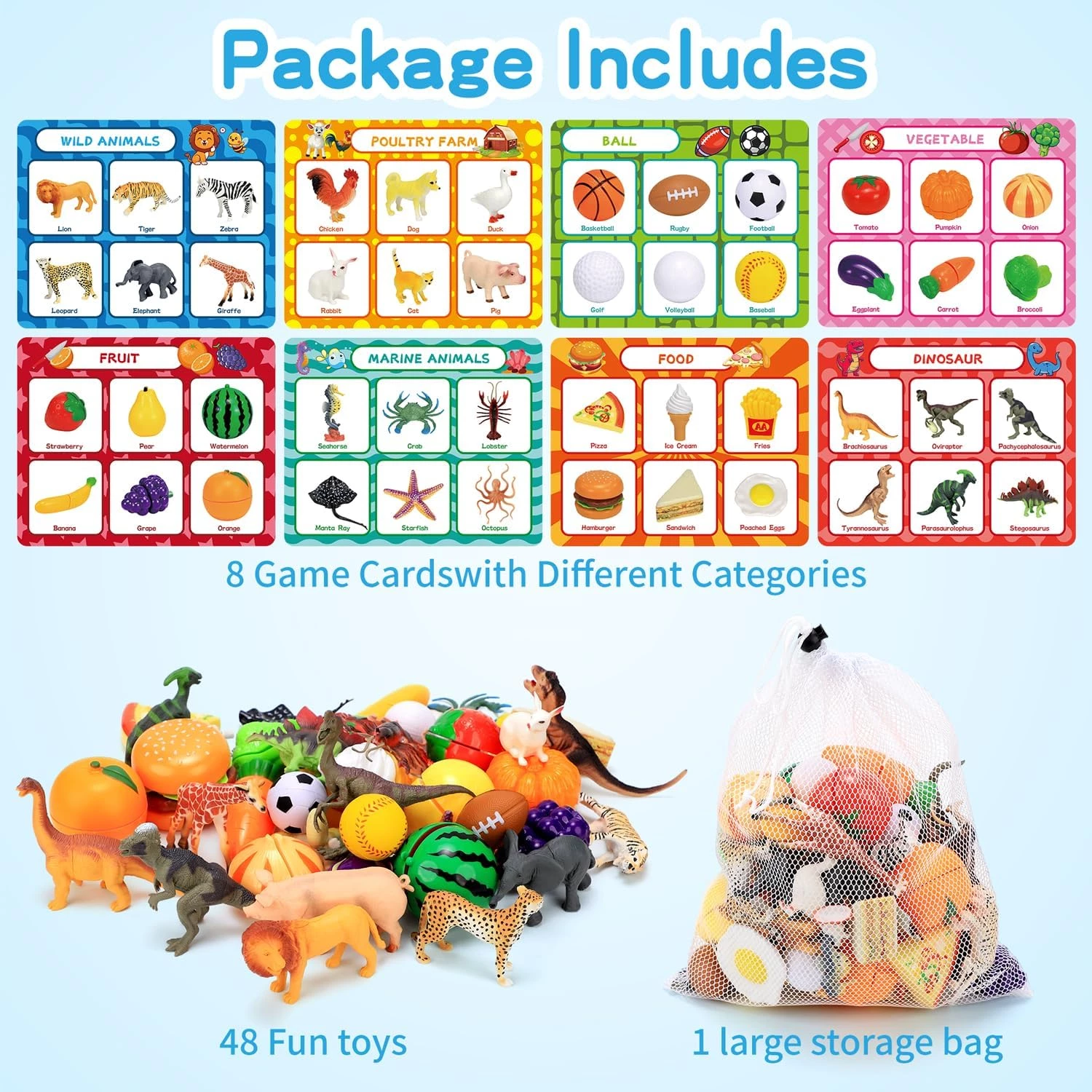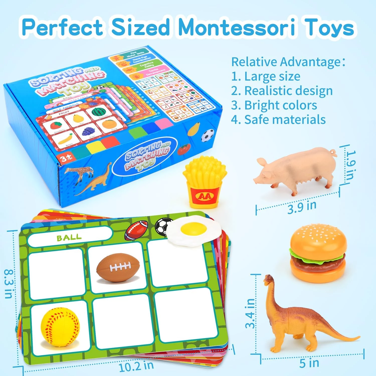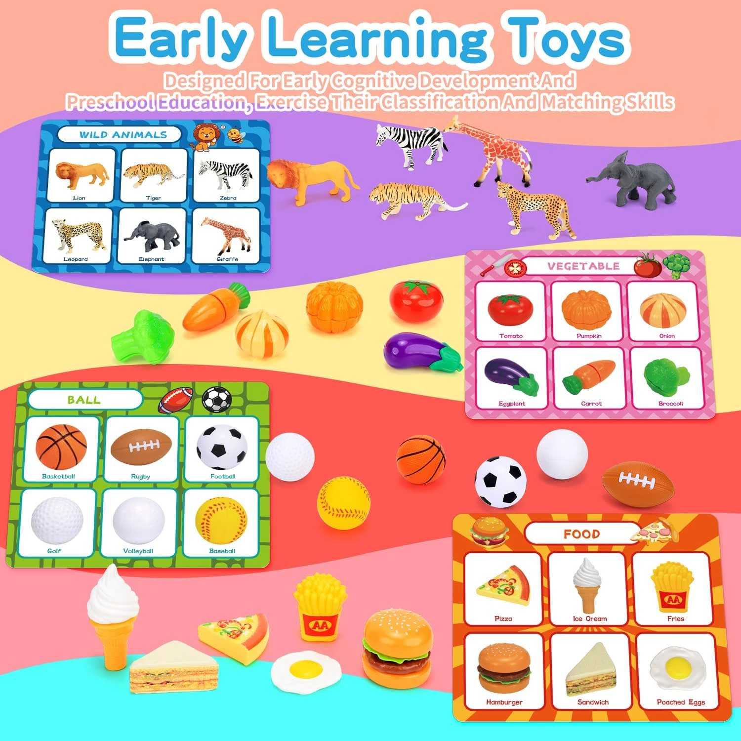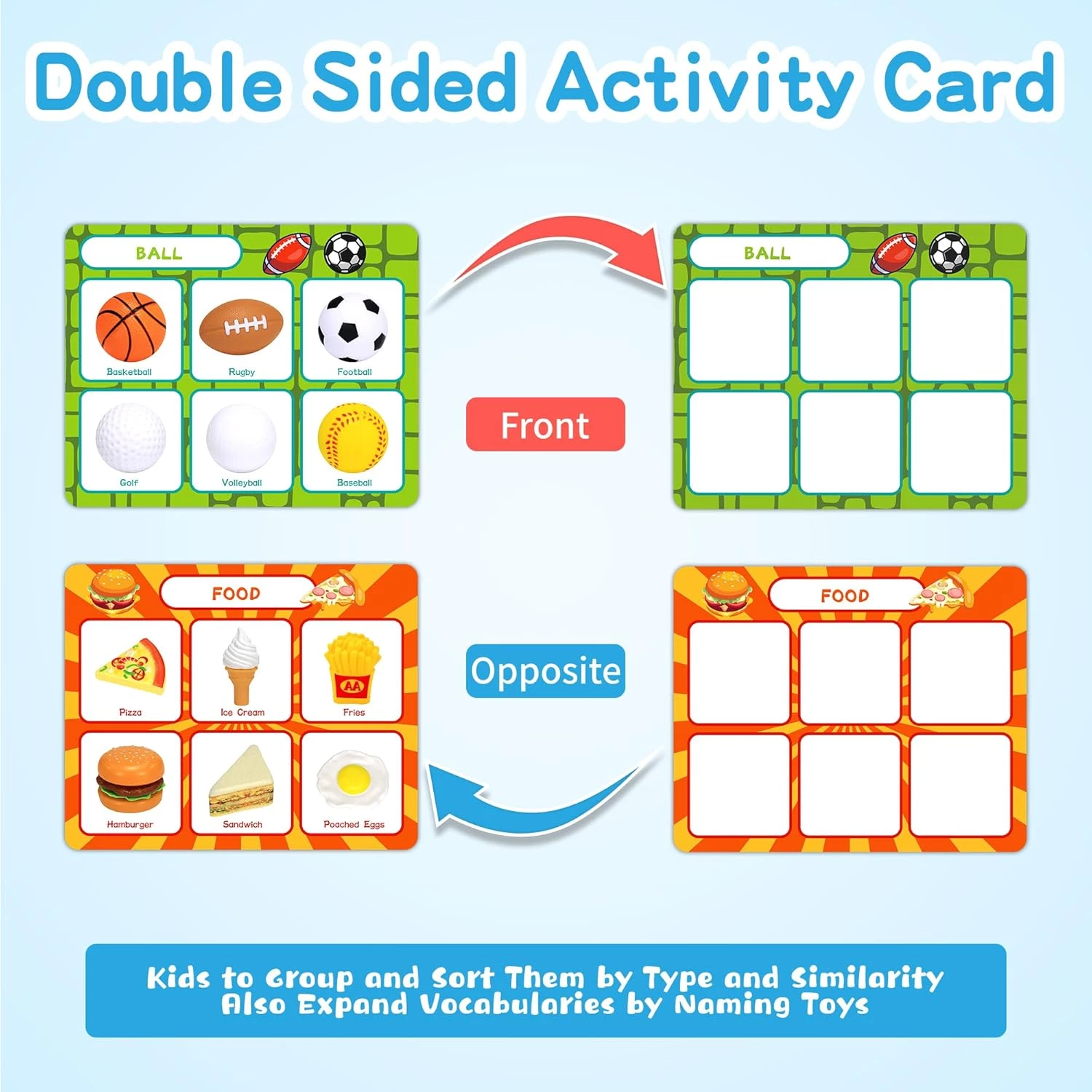 Набір включає 8 карток із завданнями, 6 фігурок диких і 6 фігурок домашніх тварин, 6 овочів, 6 фастфудів, 6 фруктів, 6 м'ячів, 6 морських риб і 6 динозаврів. Гра сприяє розвитку навичок розпізнавання видів та класифікації. Набір для сортування поєднує в собі навчання та гру, допомагаючи дітям сортувати об'єкти за певними типами відповідно до їх різних атрибутів, дозволяючи більше дізнатися про їжу, тварин, види спорту та інші повсякденні речі. Це покращує пізнавальні здібності дитини.