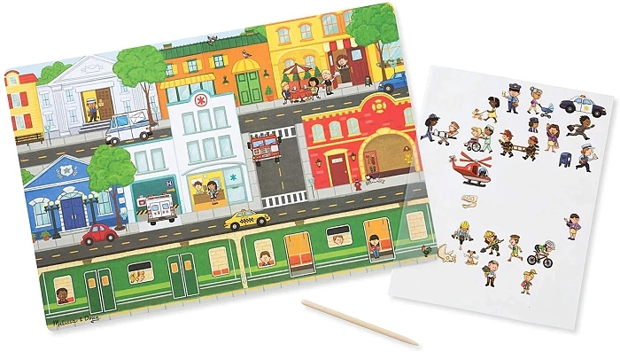Набір наклейок «Навколо будинку» від Melissa & Doug допоможе малюкам потренувати свої розумові та творчі здібності. Він буде однаково цікавий і для хлопчиків, і для дівчаток віком від чотирьох років. У комплект входить 2 картинки-сцени, а також 45 перекладних наклейок, що стосуються наступної тематики: транспорт, люди та тварини. Крім наклейок у наборі є спеціальний інструмент — дерев'яний стілус.Візьміть аркуш із наклейками, прикладіть його до того місця на зображенні-сцені, де дитина хоче розмістити наклейку і потріть її стілусом. Після цих дій наклейка переведеться на картинку.