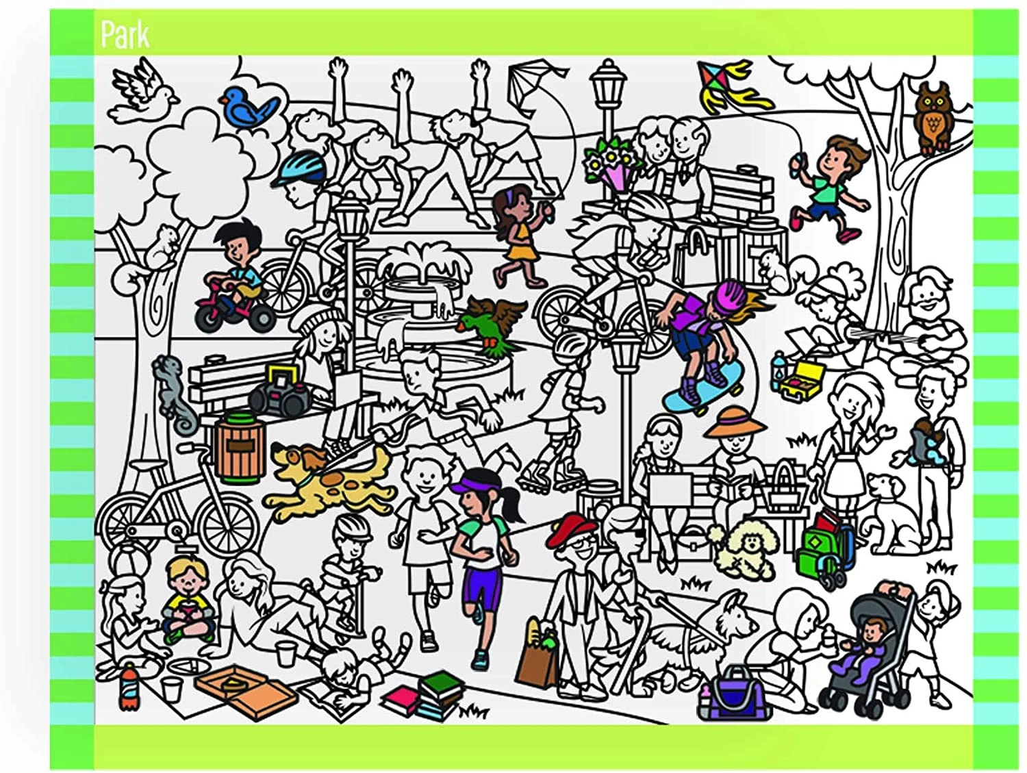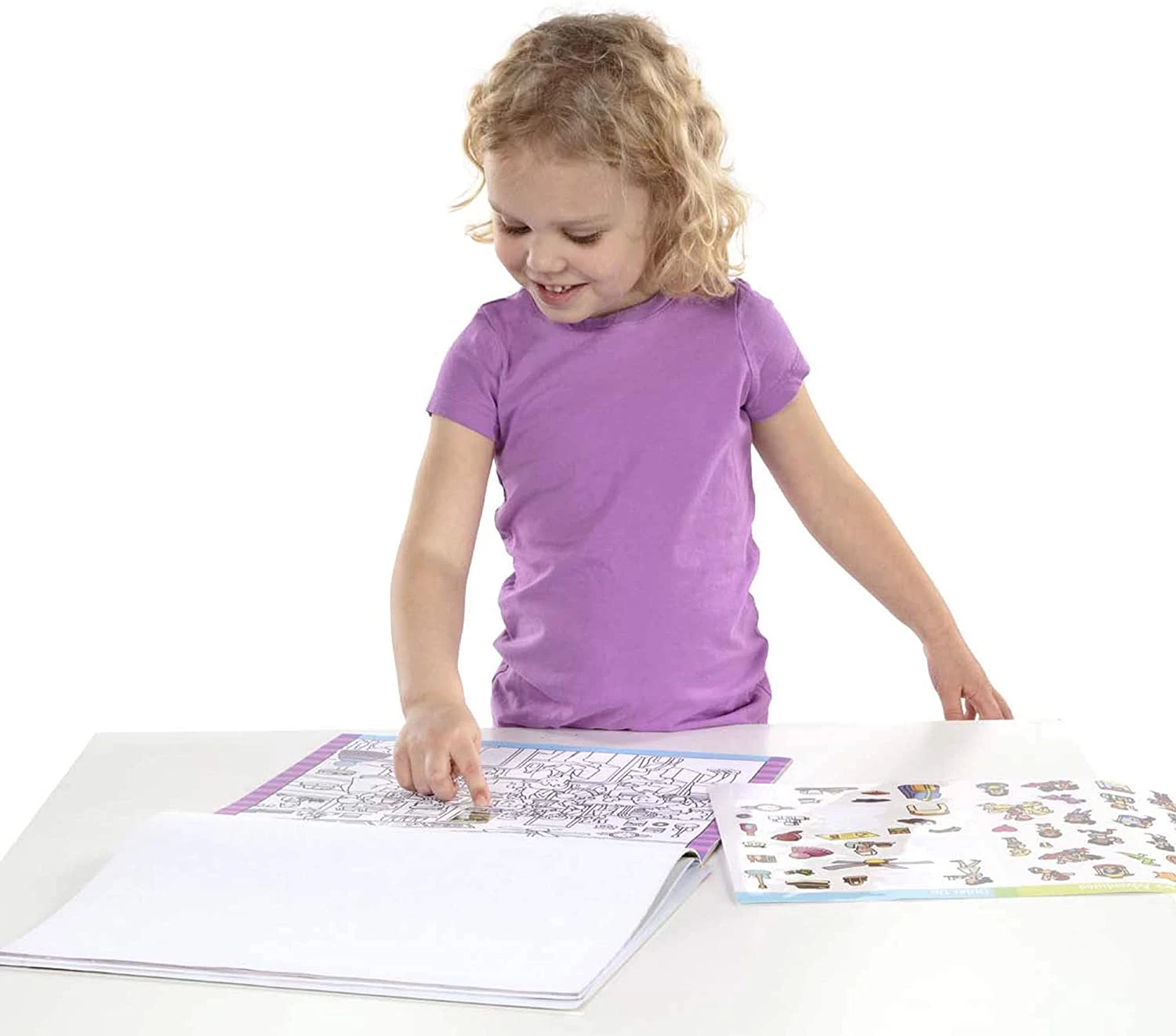 Сторінки з стікерами мають кольорове маркування, щоб діти змогли самостійно знайти куди яка наліпка підходить. У журналі буклеті є різні пейзажі: фермерський ринок, лікарня, шосе, парк, школа, аеропорт, парк розваг, ресторан, торговий центр, музей, кафе, будівельний майданчик, автовокзал і пожежна частина. Перфоровані краю дозволяють легко відірвати сторінки з наліпками відповідно зі сценами з журналу.