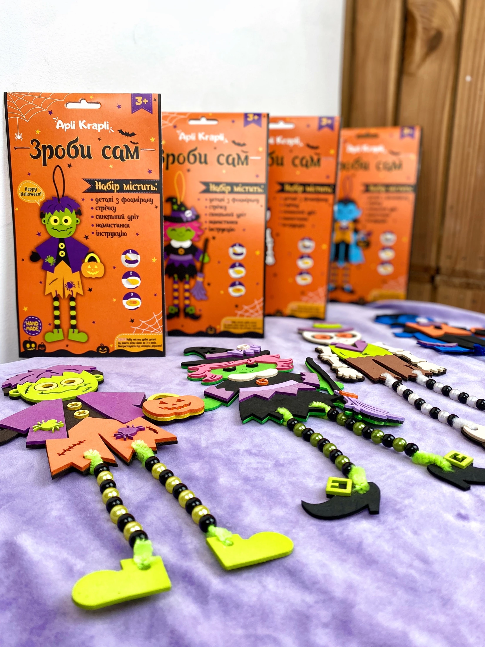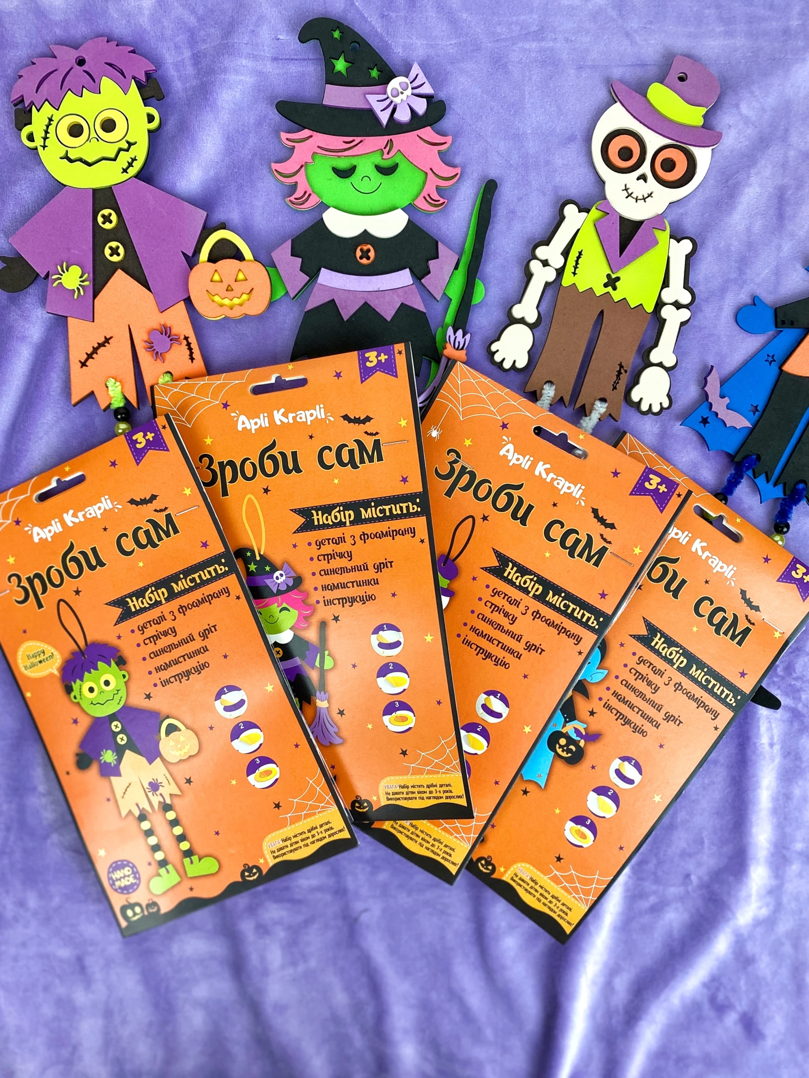 Набір для самостійного виготовлення дитячих виробів на Хелловін - ідеальний спосіб пробудити творчі здібності. Цей веселий набір включає фігурку вампіра і пропонує дітям захопливе заняття з рукоділля. Ідеально підходить для вечірок на Хелловін та створення власних святкових прикрас. Гарне рішення для творчої гри та тренування моторних навичок.