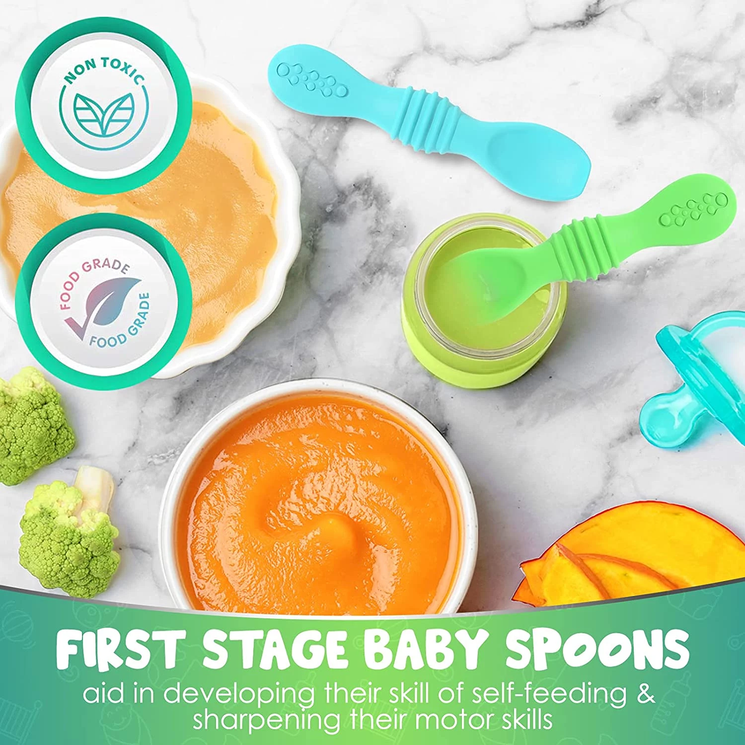 Коли ваша дитина переходить на тверду їжу, ці силіконові ложки допоможуть йому розвинути навички самостійного годування і в той же час відточити моторику. Спеціальні ложки для першого прикорму створені з урахуванням дитячих потреб, тому їх використання буде абсолютно комфортним і безпечним для дитини. Вироби мають рельєфну форму для зручного тримання і розвитку тактильних навичок. Ложку також можна використовувати для зменшення болю від прорізування зубів. Виріб ідеально поміщається в дитячу долоню. Ложка повністю зроблена з харчового силікону і не містить бісфенолу.