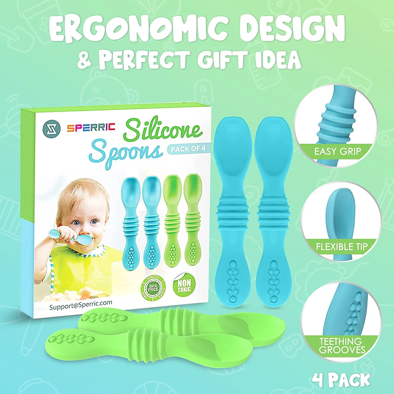 Дитячі ложки Sperric спеціально розроблені, щоб стимулювати дітей до самостійного годівлі на ранньому етапі їх розвитку. Гнучкий м'який наконечник забезпечує правильну частина прикусу, а також захищає ясна.