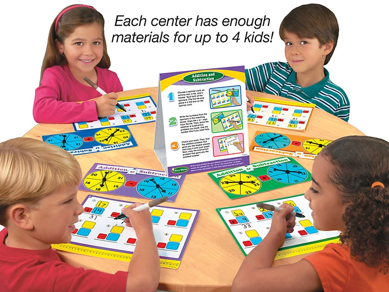 Відмінний розвиваючий набір, щоб навчиться додавати і віднімати. У ньому є всі необхідні матеріали: спіннери, маркери, картки, знаки + і -. Одночасно можуть грати до 4 дітей. Діти по черзі крутять спіннери, записують на картках цифри, що випали, визначають дію (додавання або віднімання) - і вирішують приклад.