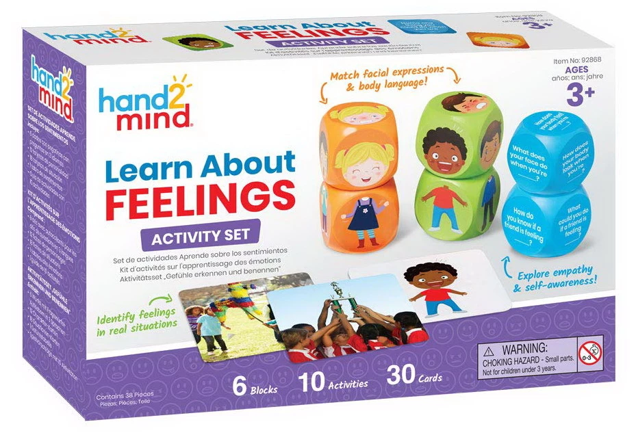 Визначте почуття за допомогою карток ситуацій і персонажів, досліджуйте співчуття і самосвідомість за допомогою 2 кубиків питань, а кубики персонажів дозволяють дітям зіставити виразу обличчя з мовою тіла. У простому керівництві представлені заняття і поради для батьків, педагогів або вчителів, які допоможуть дітям з емоціями і почуттями.