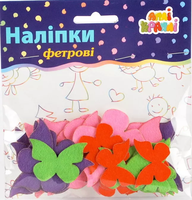 Метеликів багато не буває, а в творчих роботах дитини вони завжди можуть стати в нагоді! Саме тому даний набір фетрових наліпок стане відмінним доповненням до творчого інвентарю кожної дитини! Складений з 20 цікавих форм метеликів, він може бути використаний в різних видах творчості: аплікації, декоруванні, оформленні! При цьому, комплект має яскраву кольорову палітру, що дає ще більшу свободу в їх застосуванні! Ну і звичайно, надійне кріплення до будь-якої гладкої поверхні буде забезпечено - кожен елемент виконаний з якісних матеріалів!