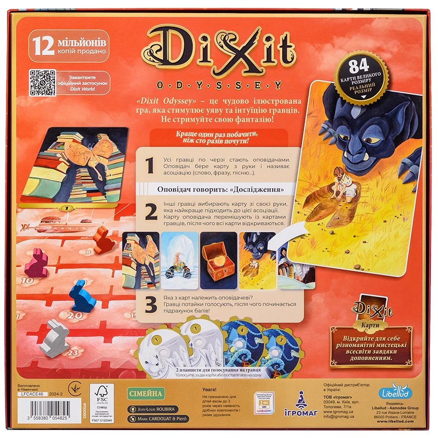 Даний набір " Одіссея "є розширенням до гри" Діксіт", він робить її більш захоплюючою і цікавою. Завдання гравців вгадати історію, розказану оповідачем і голосувати. Для цього використовуються картки з приголомшливими яскравими ілюстраціями. Є кілька режимів гри, що значно урізноманітнює процес. Можна збільшити кількість гравців, чого не можна зробити в базовій версії. З таким доповненням зустріч друзів стане більш веселою і галасливою.