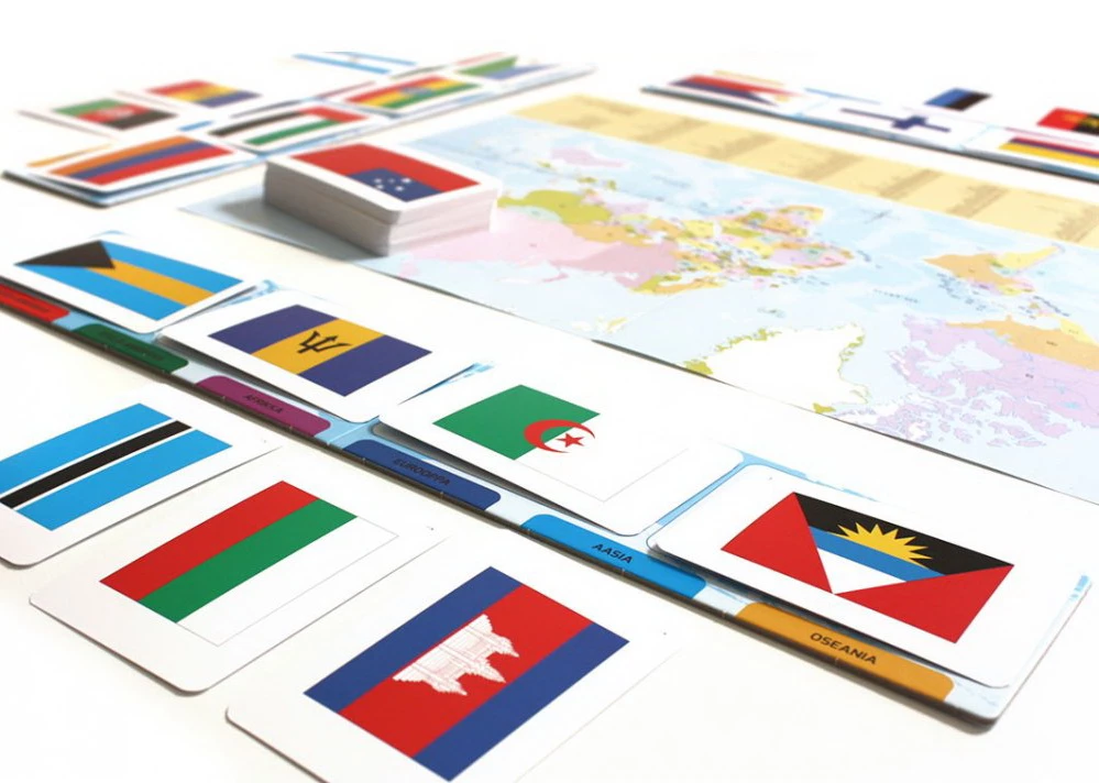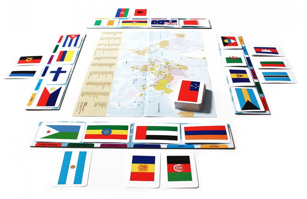 Як грати? Кожному гравцеві видається підставка з континентами, картки складаються в стопку. Учасники гри по черзі витягають картку з прапором і співвідносять з континентом на своїй підставці. За кожну правильно розташовану країну учасник отримує один бал. Перемагає той гравець, який набрав більшу кількість балів.