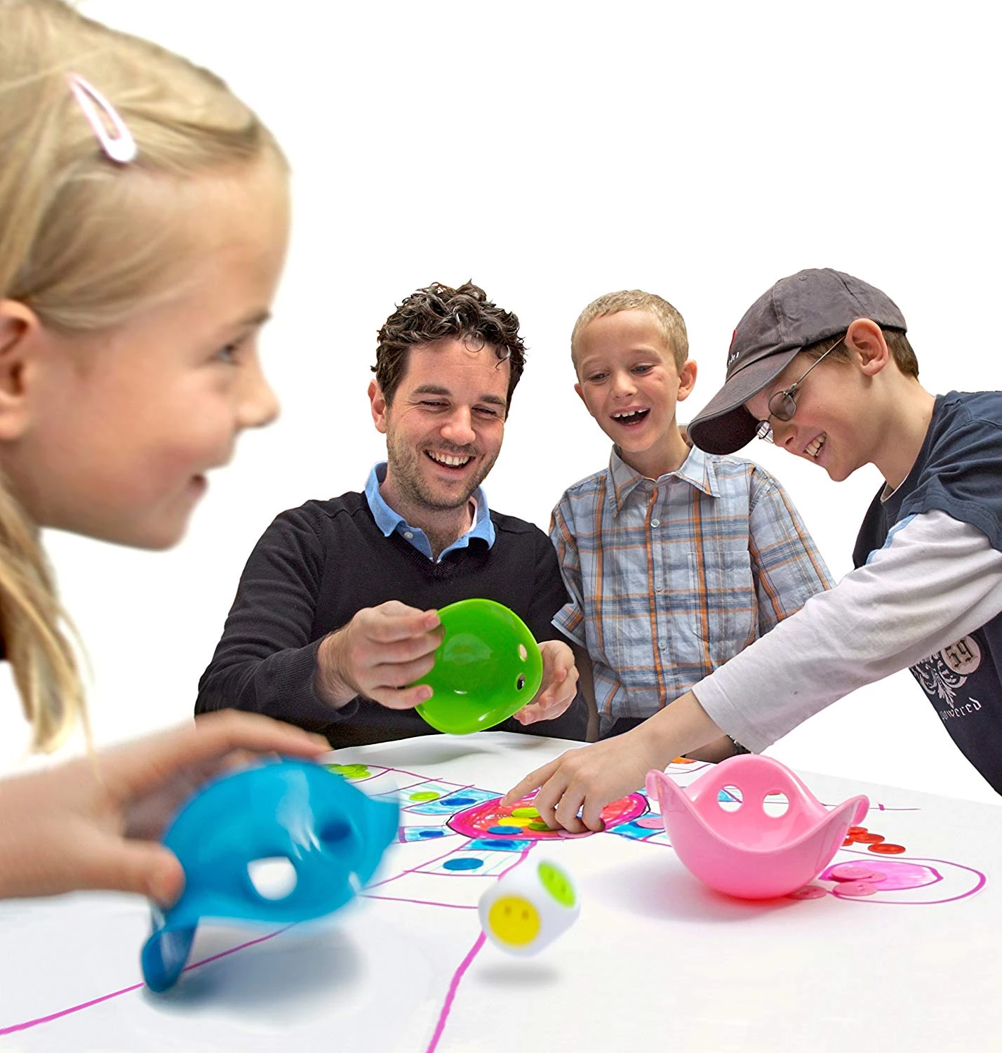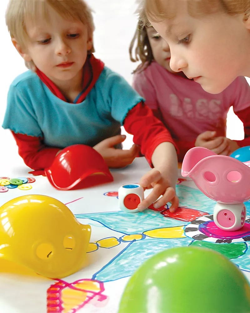 Заповніть кубик фішками всіх шести кольорів, покладіть фішки в загальну купку, поділіть шість міні-Білібіо між собою і дитиною і почніть по черзі кидати кубик.