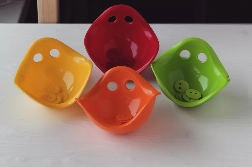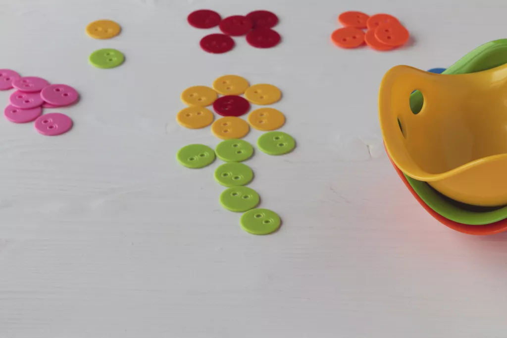 Розкладайте разом з дитиною різнокольорові фішки в формочки міні-Білібіо точно таких же кольорів.