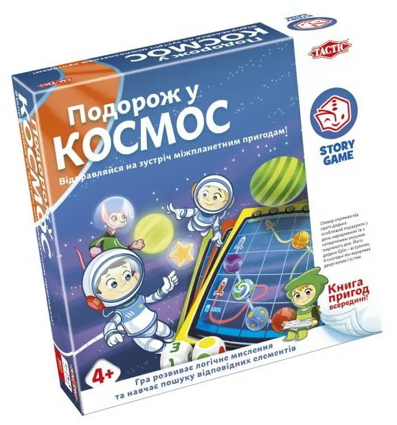 Розвиваюча настільна гра може стати прекрасним проведенням часу в колі родини або друзів. Вона заснована на принципі лото, але відрізняється тим, що змагання відбувається в космосі. Гра допомагає розвинути уважність, спостережливість і мислення. Необхідно знаходити відповідне число в своїх картках і закривати його фішками. У наборі додається цікава книга на двох мовах про космос, про фантастичні пригоди друзів у Всесвіті. Гра може стати чудовим подарунком на будь-яке свято.