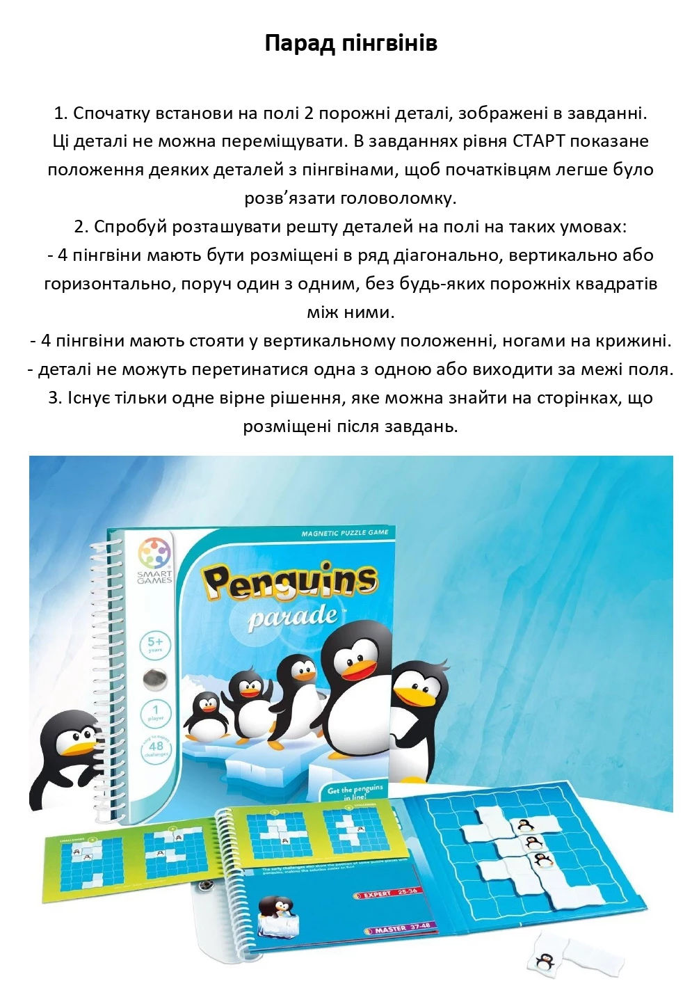 Основна мета гри - заповнення поля магнітними деталями фігурками пінгвінів. Потрібно правильно розташувати пінгвінів в лінію. Пінгвіни завжди повинні стояти лапками на крижині. Не можна перевертати фігурки пінгвінів верх ногами. Всі завдання різні, завдяки двом порожнім детальках крижинах, які потрібно розмістити на ігровому полі. Набір підходить для подорожей. Захопить дітей на довгий час.
