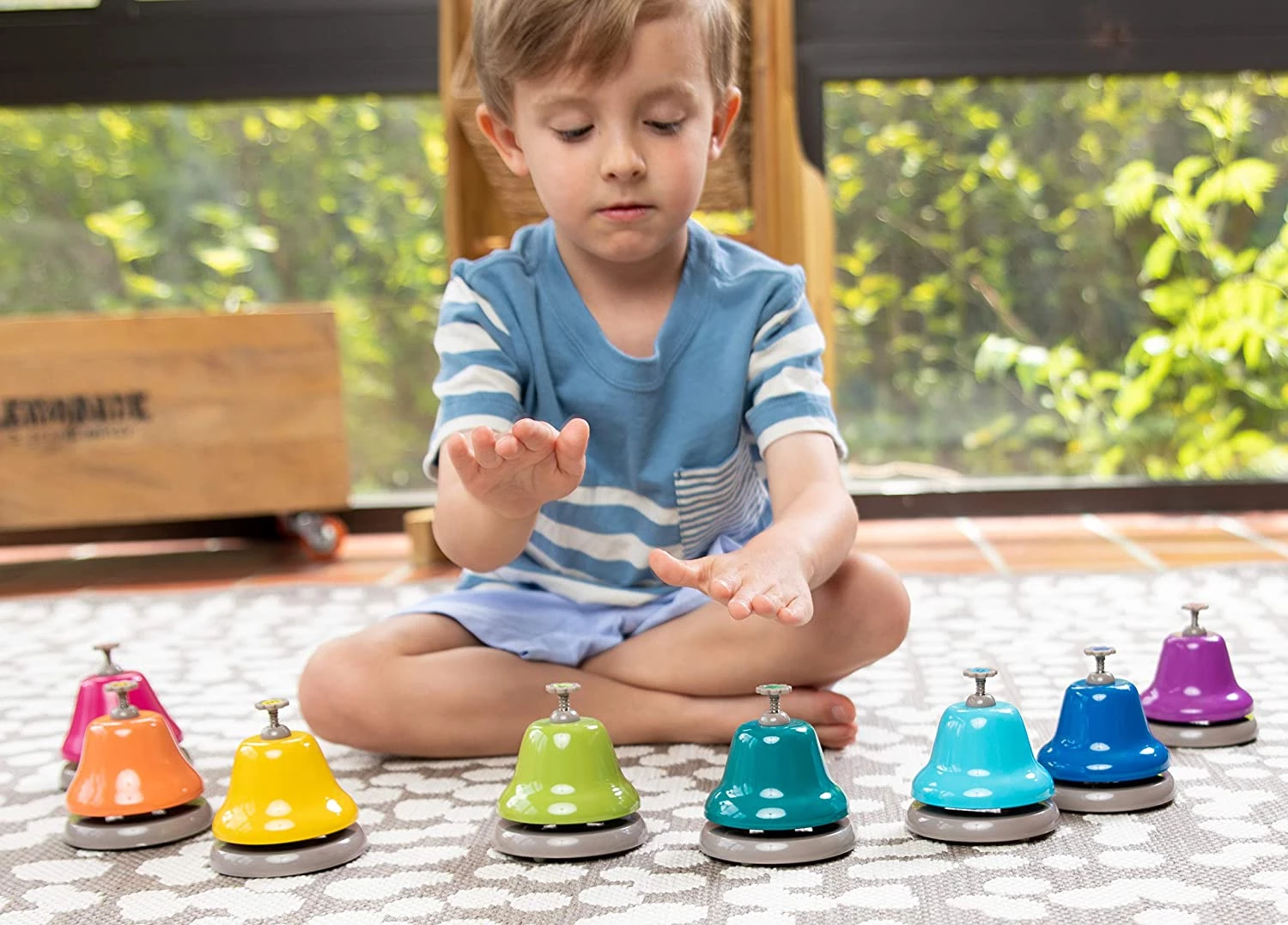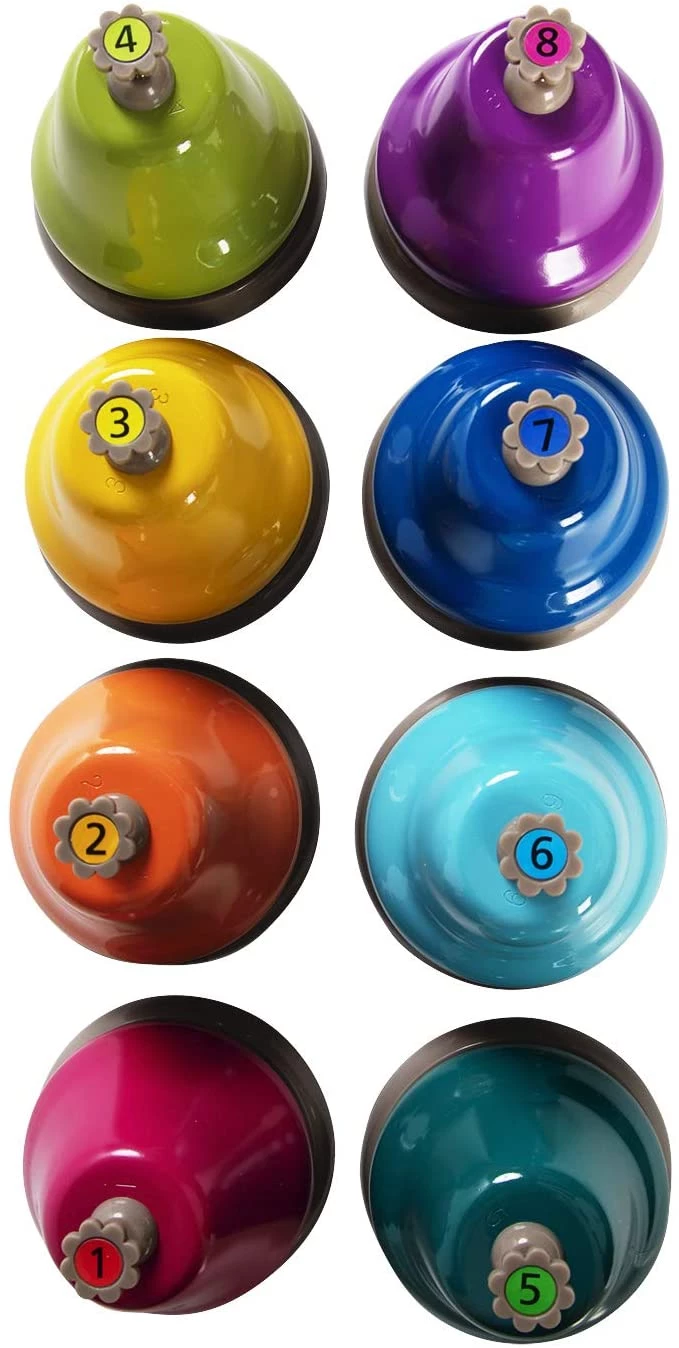Ці милі дзвіночки допоможуть вашій дитині розвинути музичні здібності, логіку, координацію рухів, кмітливість. Також допоможе вивчити кольори і цифри. У наборі 8 пронумерованих різнокольорових дзвіночків, що дозволяє придумати нескінченну кількість розвиваючих ігор. Дзвіночки видають приємний дзвін, і завдяки їх кількості, можна придумати мелодію. Можна називати різні цифри, і попросити дитину натиснути на потрібний дзвіночок. Також це можна робити, засікаючи таймер. Тоді з'явитися більше азарту, і захочеться швидше знайти потрібну цифру.