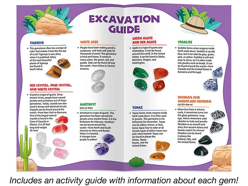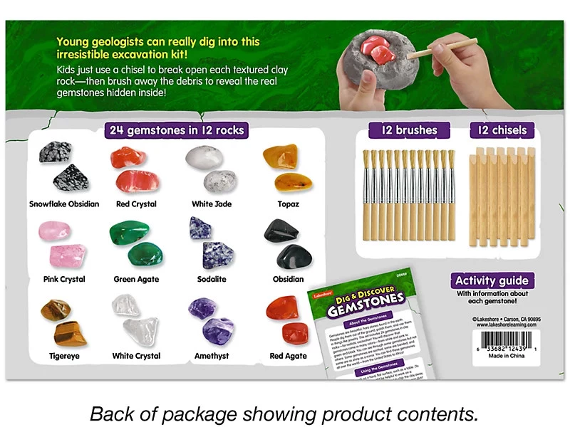 Усередині скам'янілостей юних дослідників чекає справжній сюрприз — блискучі дорогоцінні камені! Просто вийміть їх назовні, помийте та насолоджуйтесь чудовим блиском. Ви отримаєте 12 каменів, кожен з двома унікальними дорогоцінним камінням, а також 12 пензлів та долото.