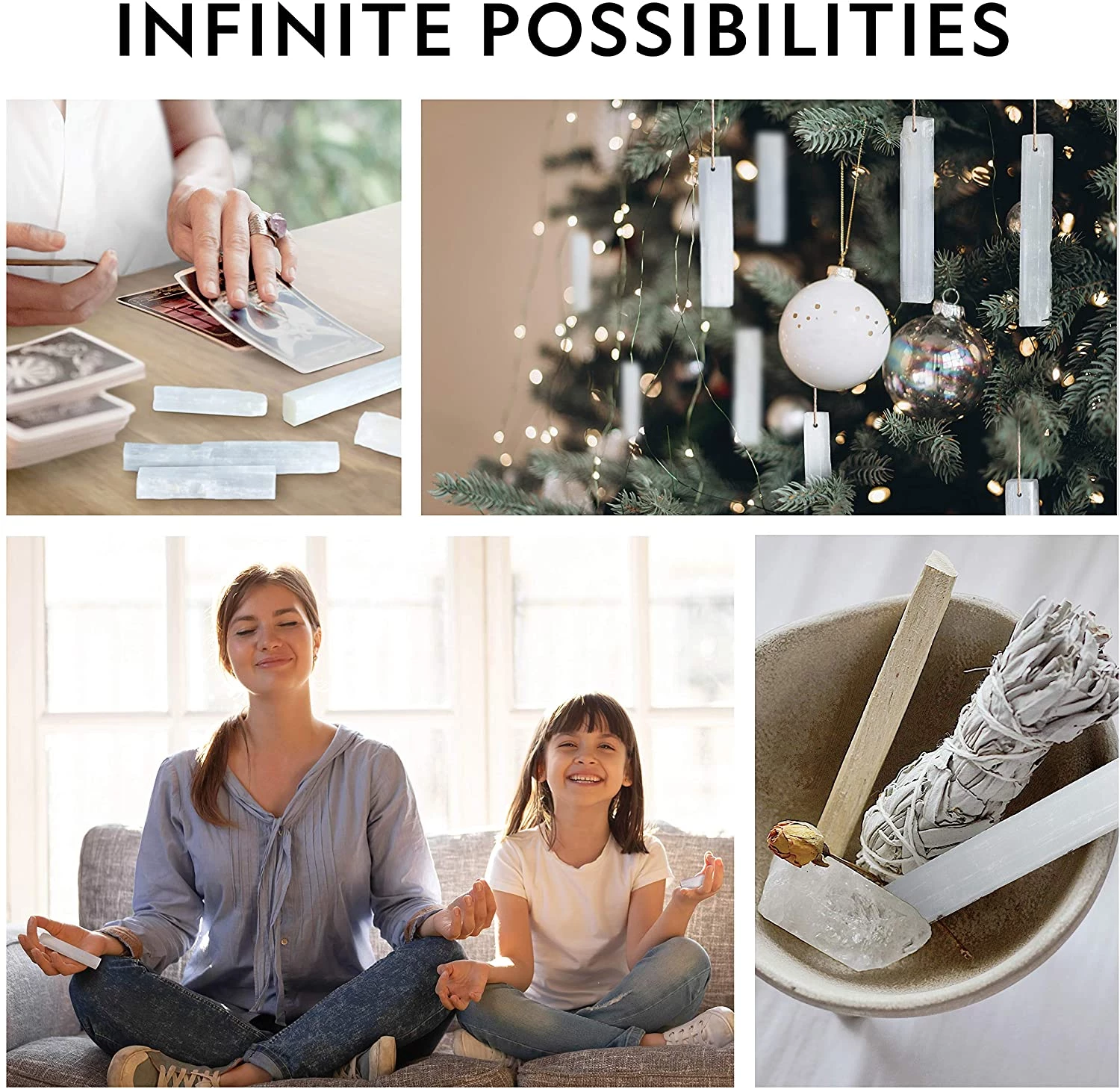 Довгі палички селенита по довжині до 13 см, а короткі - до 7,62 см. Кожна паличка має товщину від 0,64 см до 1,27 см. У наборі приблизно 5 довгих і 15 коротких паличок селенита. Вони є фантастичним доповненням до будь-якої колекції каменів, ними можна поділитися з друзями або використовувати як частину домашнього декору!