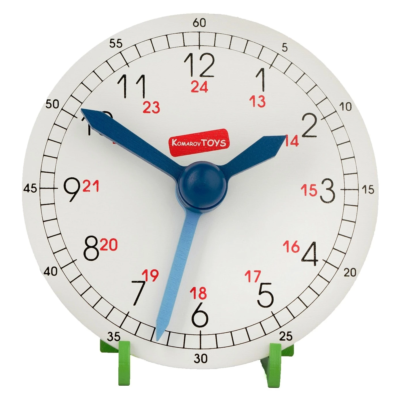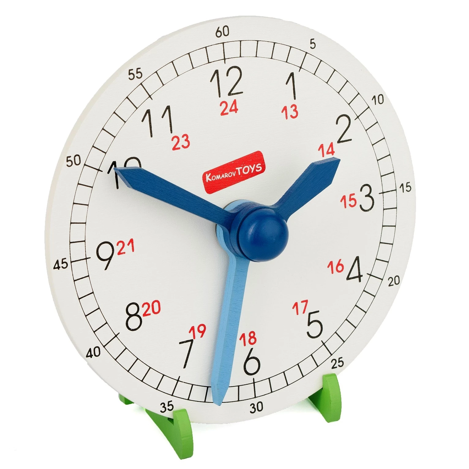 Модель виконана з натуральної деревини та покрита безпечною фарбою на водній основі. Цифри нанесені методом шовкографії. Діаметр циферблата - 18 см. Товщина стрілок, циферблата та підніжки - 6 мм.